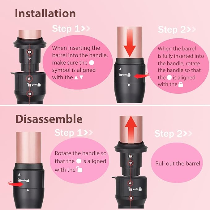 - ✅【Installation】Align the triangle mark on the curling tube with the triangle symbol on the handle. Then insert the curling barrel into the handle. Finally, turn right to lock. (Turn left to unlock). For detailed instructions, please contact us