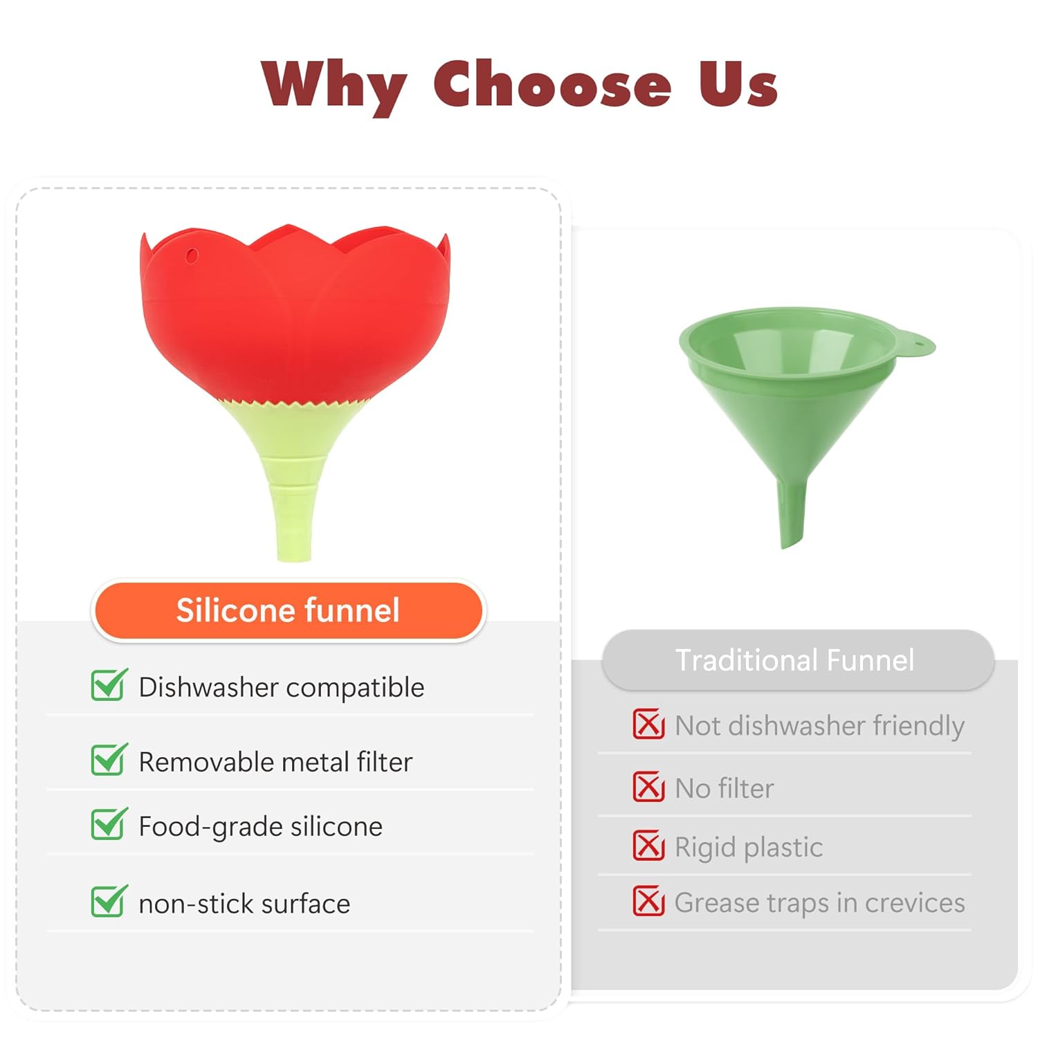 - Wide Application: The silicone funnels are very suitable for transferring liquids, powders, granules, etc. It is suitable for almost any container. It is a good gift for friends, family, housewives, and is suitable for kitchen, home, party and other occasions