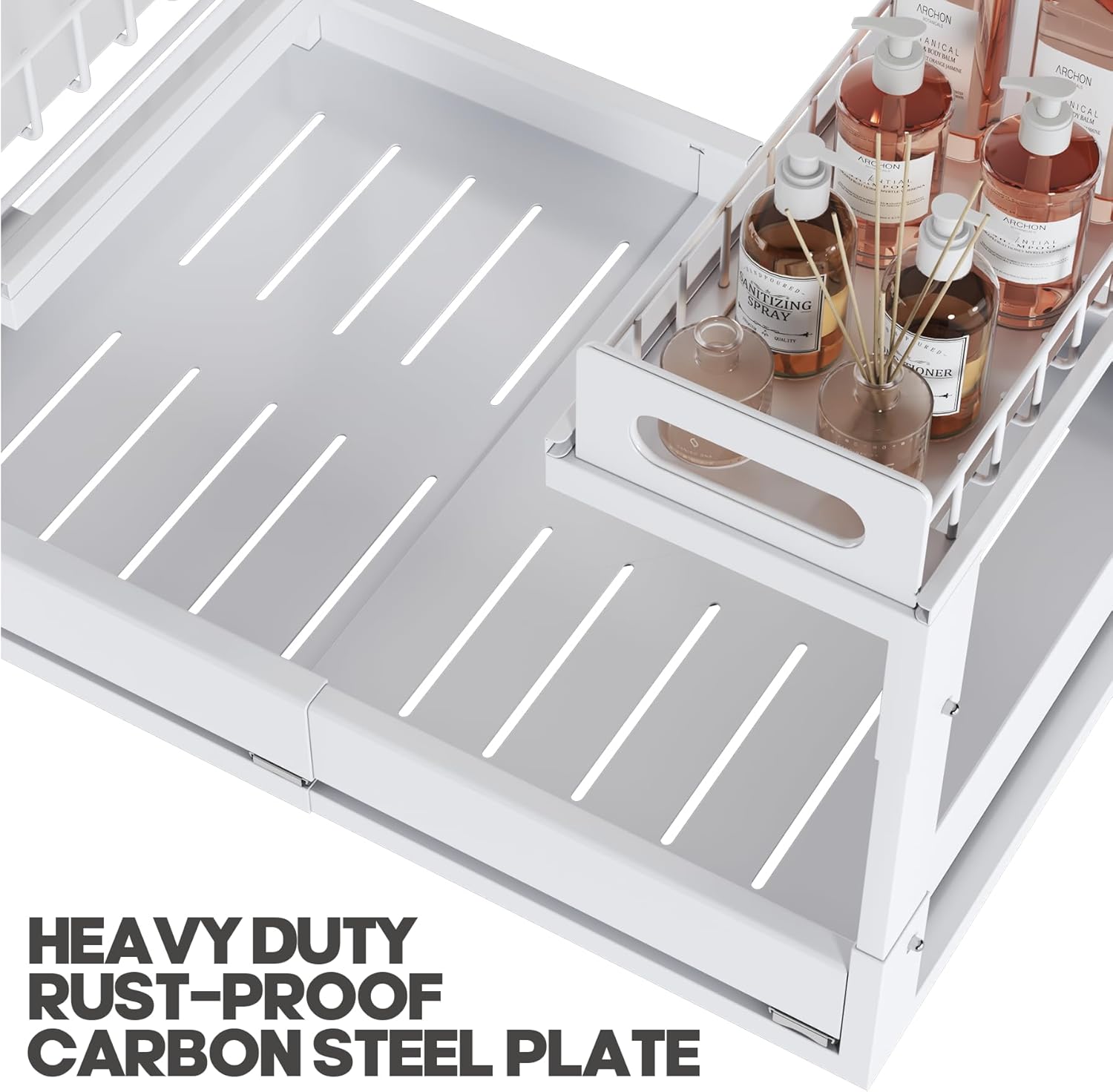 - ăPremium Metal Frame&Multi-functionăMade from sturdy metal, this organizer is built to last and holds heavy bottles, cleaning supplies, and kitchen essentials without bending. Powder-coated rust-resistant finish ensures long-term durability. Perfect for kitchens, bathrooms, and laundry rooms, this under sink storage solution makes the most of every inch. Whether for cleaning products, toiletries, or cookware, it keeps everything neatly stored and within reach.