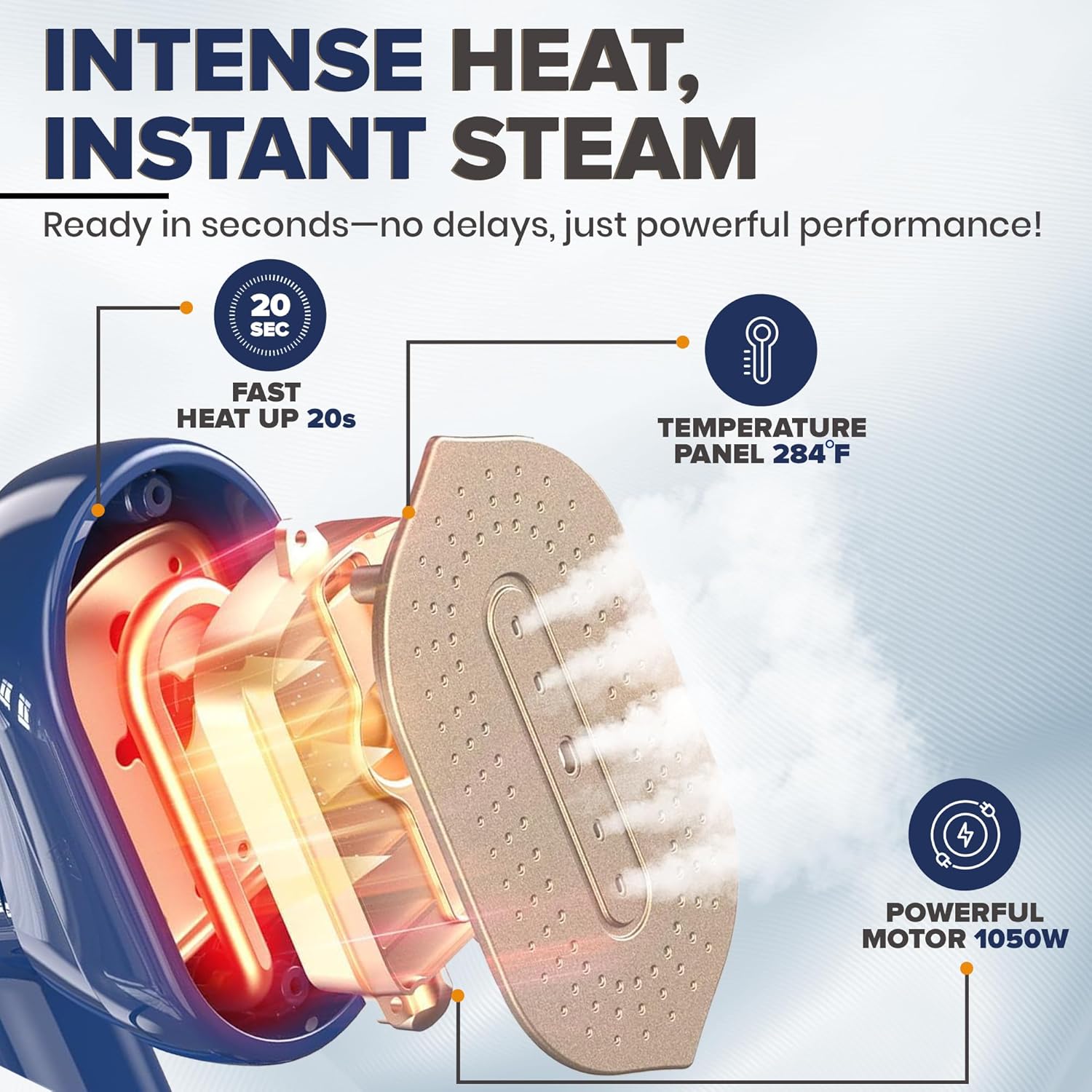 - 𝗙𝗮𝘀𝘁 & 𝗣𝗼𝘄𝗲𝗿𝗳𝘂𝗹 𝗪𝗿𝗶𝗻𝗸𝗹𝗲 𝗥𝗲𝗺𝗼𝘃𝗮𝗹 – Experience professional-grade steaming with 1050W of powerful steam output. Our high-performance clothing steamer instantly removes stubborn wrinkles, creases, and odors from various fabrics, including cotton, silk, linen, wool, and polyester, leaving your clothes fresh and smooth within seconds.