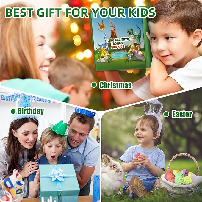 - 🎈【Best Gifts for Boys & Girls】This bath bombs set is the best gift for Christmas, Birthday, Party Favors, Easter Hunt, Egg-Collect, Thanksgiving Day, New Year, Goody Bags etc., It comes individually wrapped in a beautiful gift box with vivid colo. It can be a perfect gift for kids 3,4,5,6,7,8,9,10 years old, and turn any ordinary bath time into an unforgettable evening!