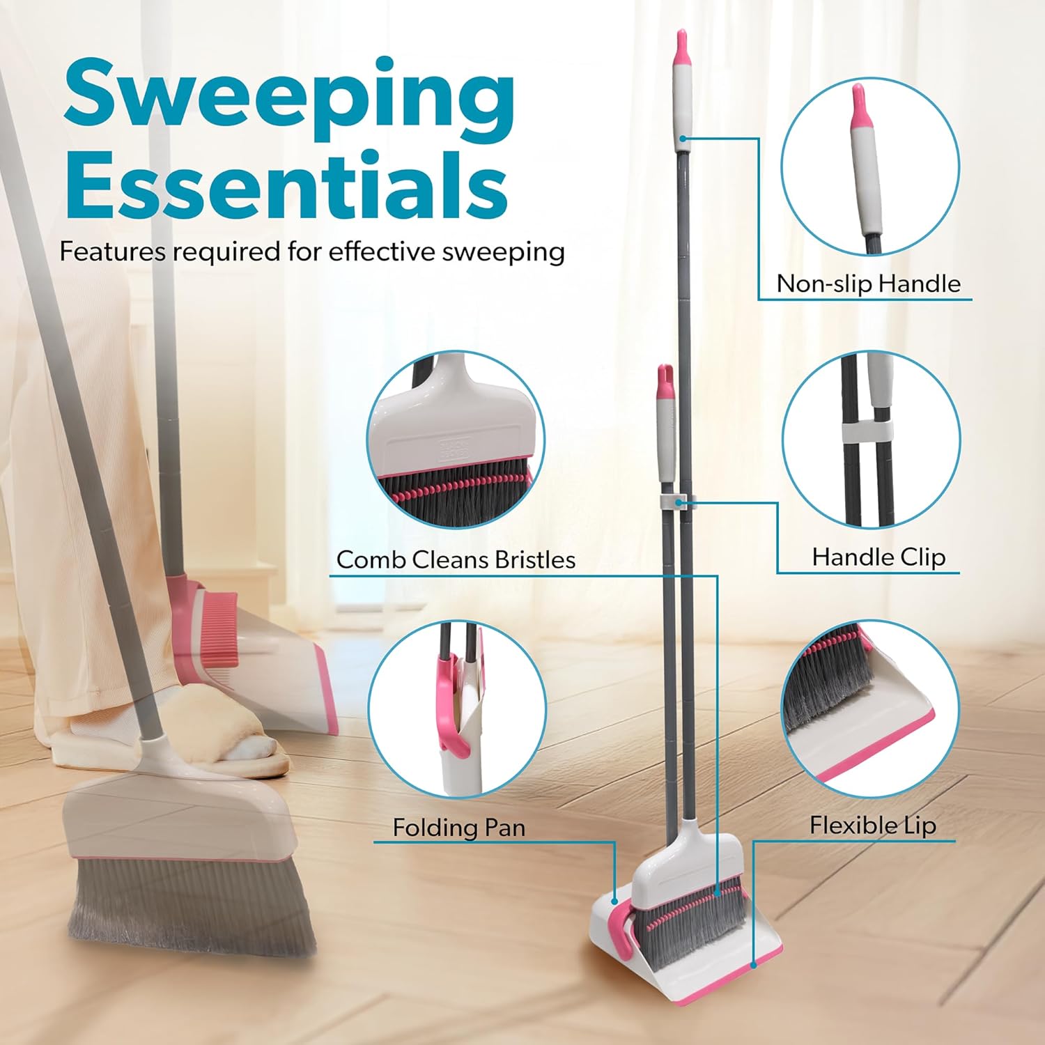 • Self Cleaning Comb Design - Sturdy teeth at the top of the dustpan comb the broom, when it collects hair/dust/lint which usually gets tangled into the bristles. Otherwise, you would need to remove them manually - not the most pleasant experience. The dustpan has a rubber lip and seamlessly sticks to the floor. It picks up everything, including the smallest particles, in the first swoop, so you will finally spend less time cleaning - more time living!