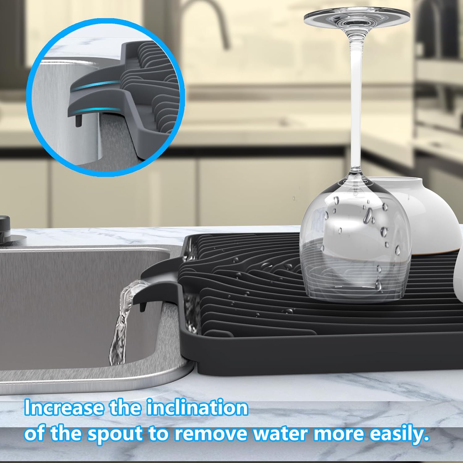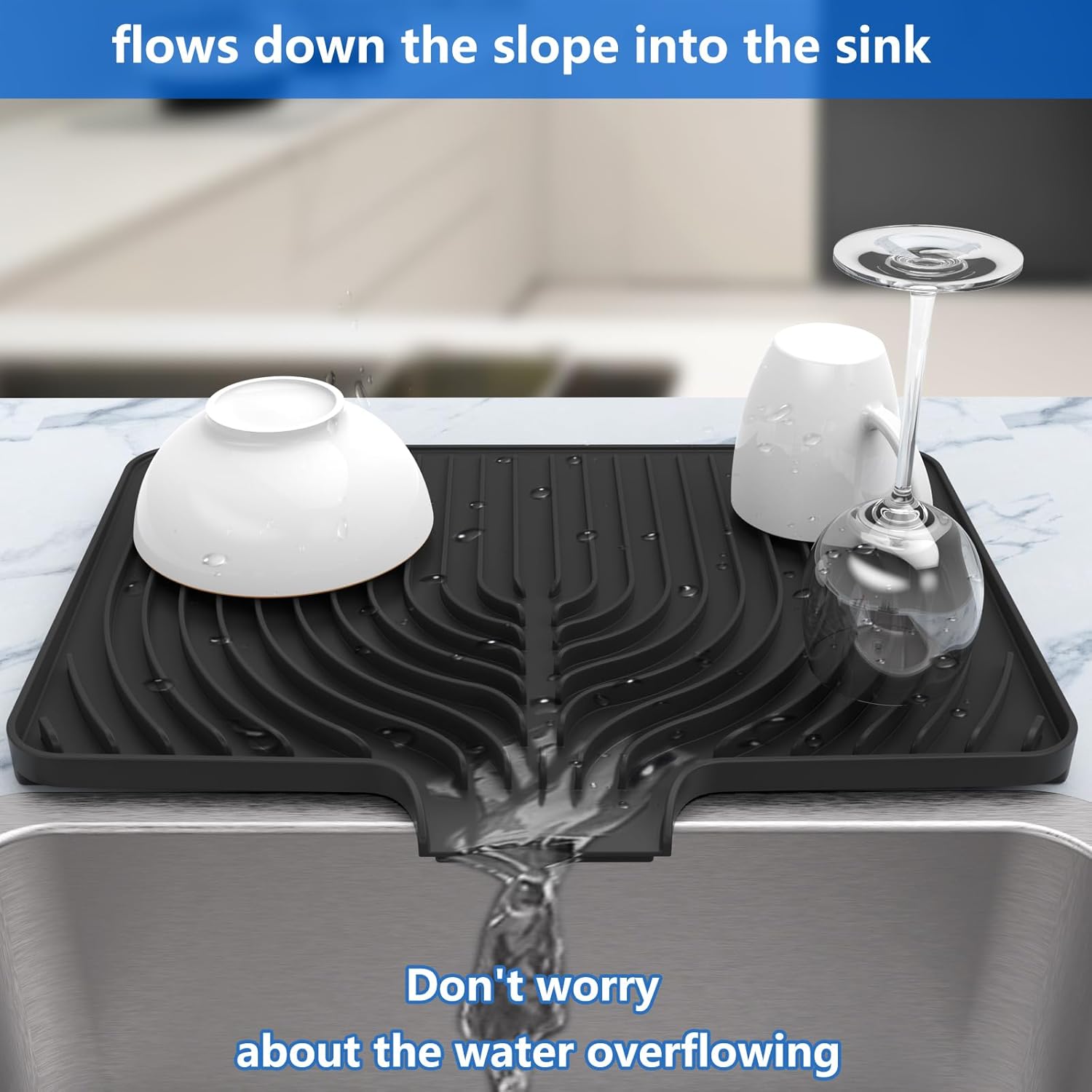 Kitchen Drying Mat for sink with a bulged edge,18"×12"Silicone Dish Drying Mat with built-in Drain Spout, Rubber Dish Mat for Kitchen (18"×12"black)