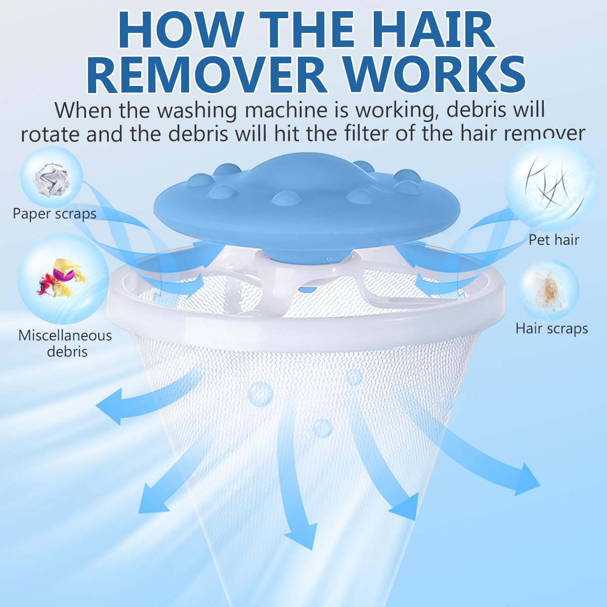 - Upgrade Pet Hair Remover For Laundry: Our floating hair filtering mesh works by staying on the water's surface throughout the wash cycle, it won't damage clothes. As your machine fills with water, it floats to the perfect position to catch every stray hair that floats to the top