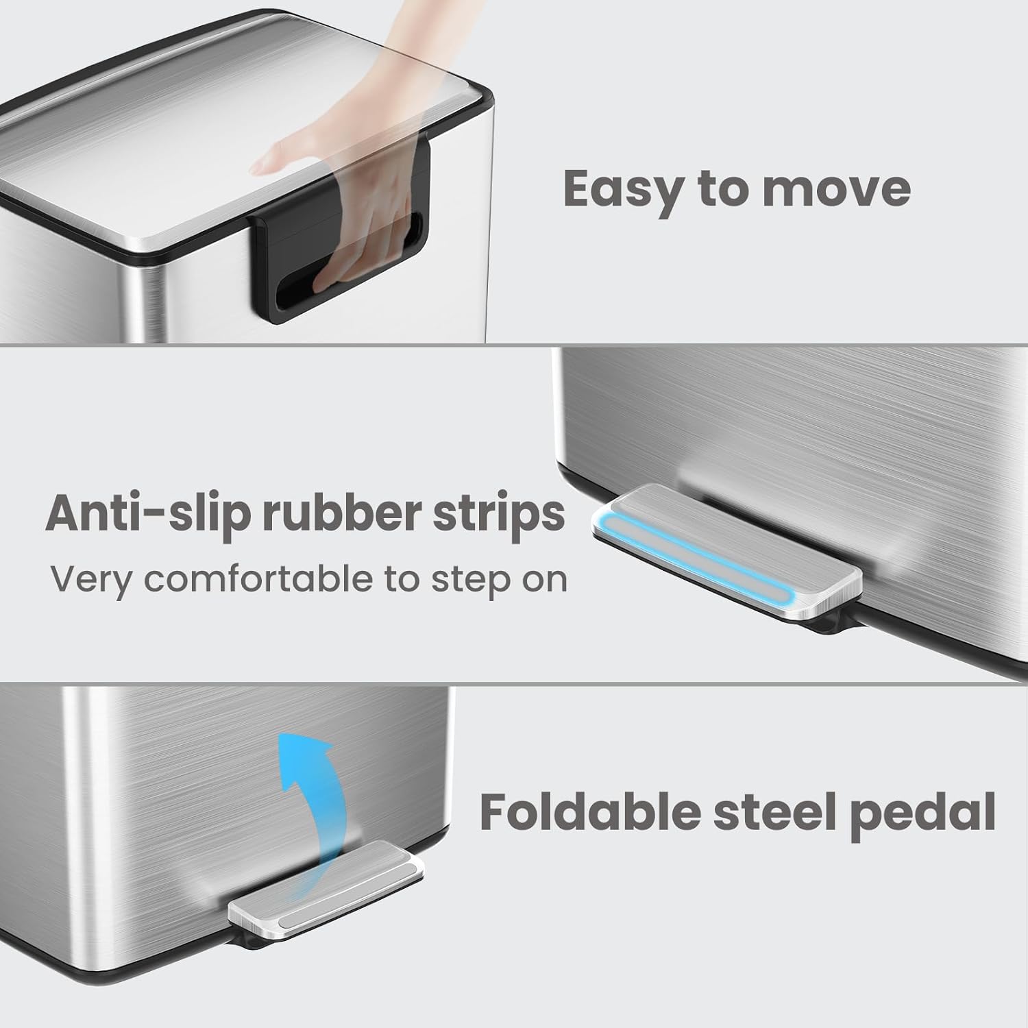 - Sturdy: The rectangle trash can has stainless steel, anti-fingerprint exterior and PP plastic inner bucket for reliable strength.