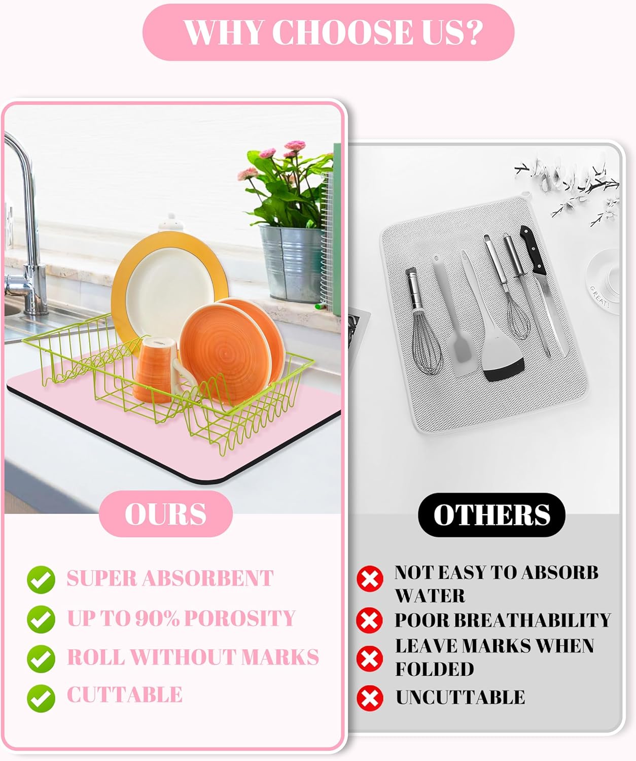 - Super Absorbent: Dish Drying Pad is made of super absorbent nano, the drying pad is soft and highly absorbent, which can dry quickly. In addition, the drying mat is thick enough to better protect countertops, tableware, and glassware from damage and contamination.