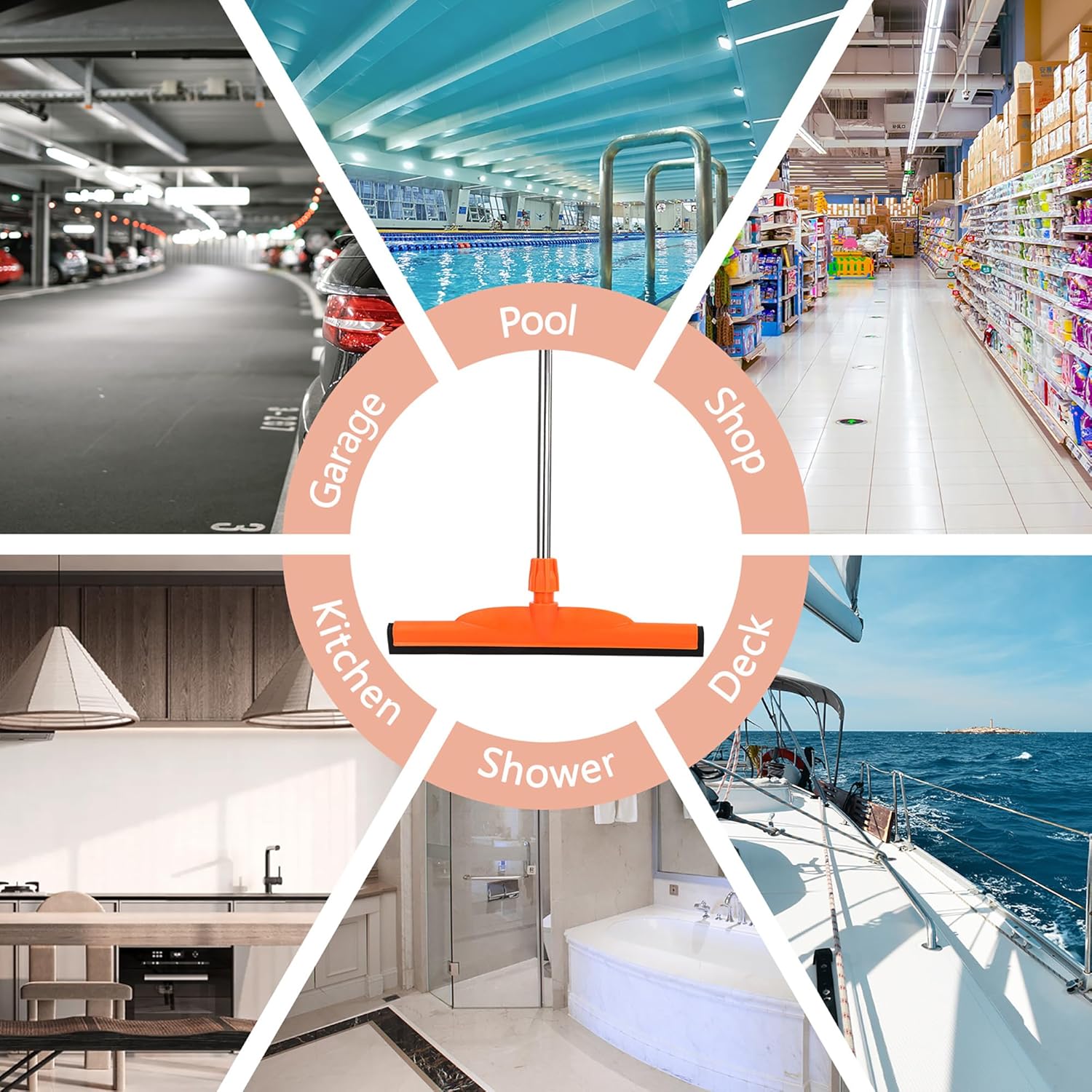 - Floor Squeegee Broom Multipurpose: Floor squeegee scrubber with 51ββ stainless steel pole - versatile cleaning for multiple surfaces, to dry floor surface efficiently and remove dirt and hair easily. Suitable for garage courtyard shower bathroom pet hair fur floor marble glass tile water foam cleaning. Whether youβre dealing with concrete floors, tile floors, shower areas, decks, or commercial spaces like garages, hospitals, hotels, and pools, this floor squeegee handles it all with ease
