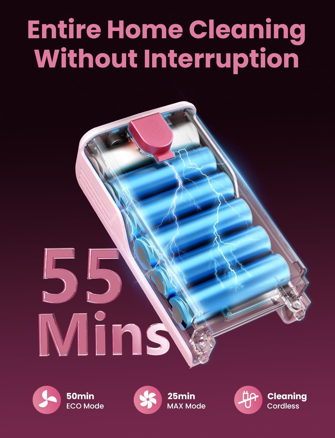 - ๐ฑ5๐ ๐ถ๐ป๐ ๐ฅ๐๐ป๐๐ถ๐บ๐ฒ ๐๐ถ๐๐ต ๐ฅ๐ฒ๐บ๐ผ๐๐ฎ๐ฏ๐น๐ฒ ๐๐ฎ๐๐๐ฒ๐ฟ๐: S2 cordless vacuum includes a 6x2500mAh detachable battery that provides up to 55 minutes of cleaning on Eco Mode, and 25 minutes on Max Mode. Easily swap batteries and recharge for extended use without interruption.