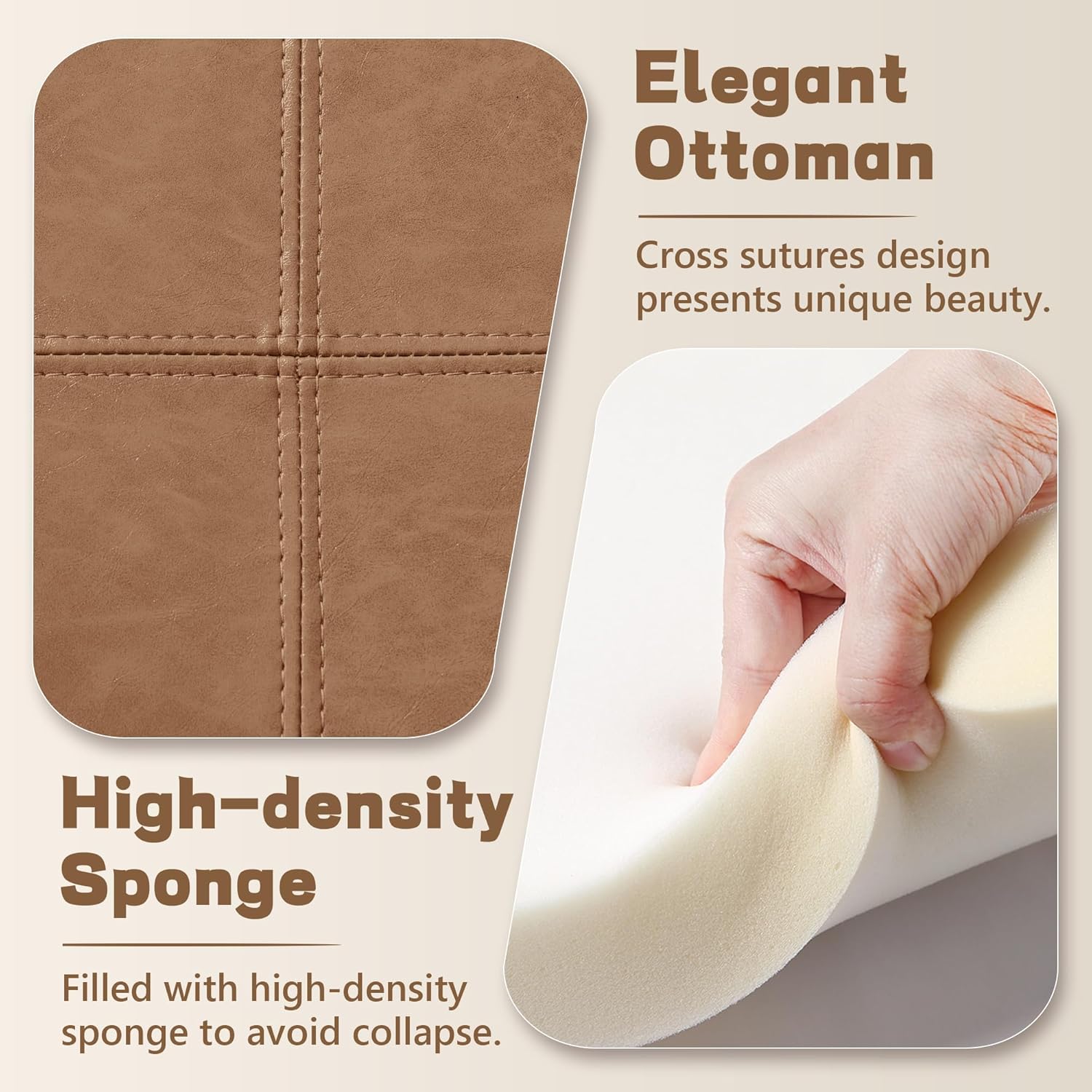 - Exquisite Design: PU leather fabric and hand-stitched top design gives this ottoman coffee table an elegant appearance. There is enough high-rebound sponge inside the top, which keeps the round ottoman full and beautiful. Removing the things from top will not leave ugly indentations