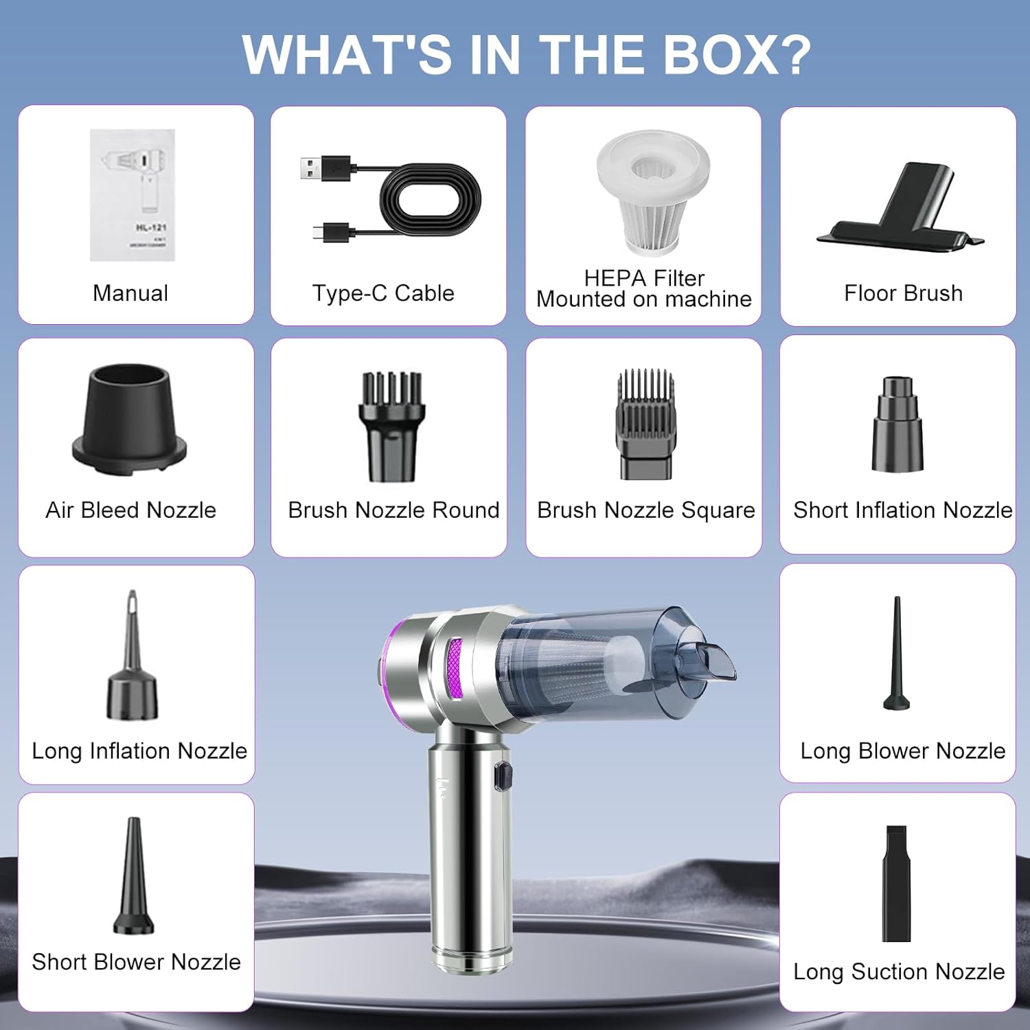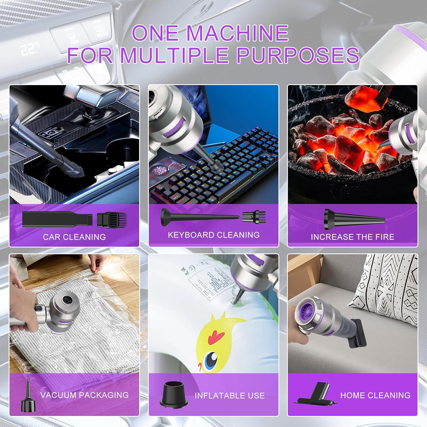 - 【Fast Type-C Charging & 2-in-1 Blower】- For Car, RV and Camping. Forget long waits! A full charge takes only 3.5 hours via the modern Type-C port (5V/1.5A adapter included). Beyond sucking, it powerfully blows! The blower function is perfect for inflating air mattresses for camping, pool floats, and balloons, or for clearing dust from computers and car corners. The car vacuum cleaner high power is a must-have for RV owners and outdoor adventures.