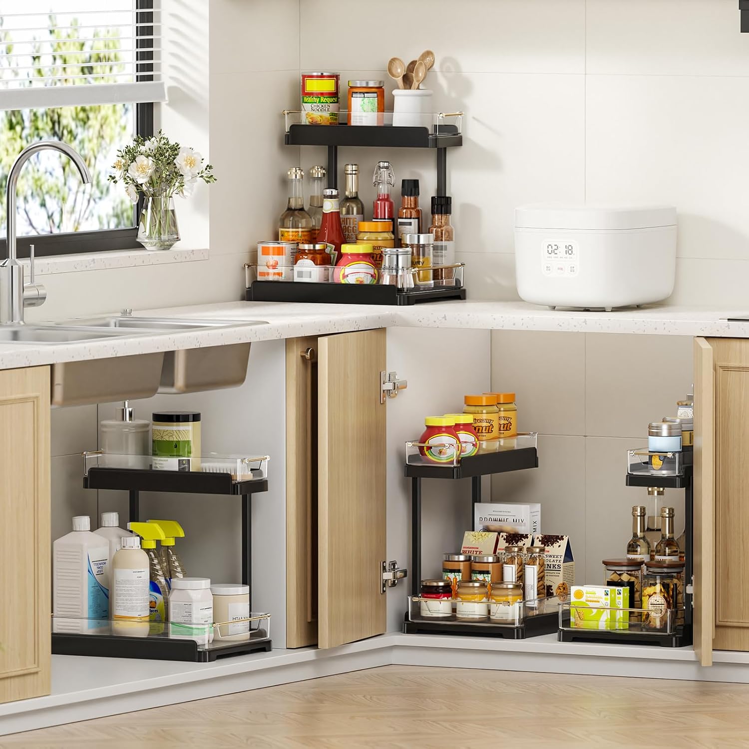 - 【Multi-Space Fit】 Under sink storage organizers are perfect for kitchens, bathrooms & laundry rooms. Fits seamlessly into under sink, cabinet, countertop, pantry, and tight space to double storage instantly