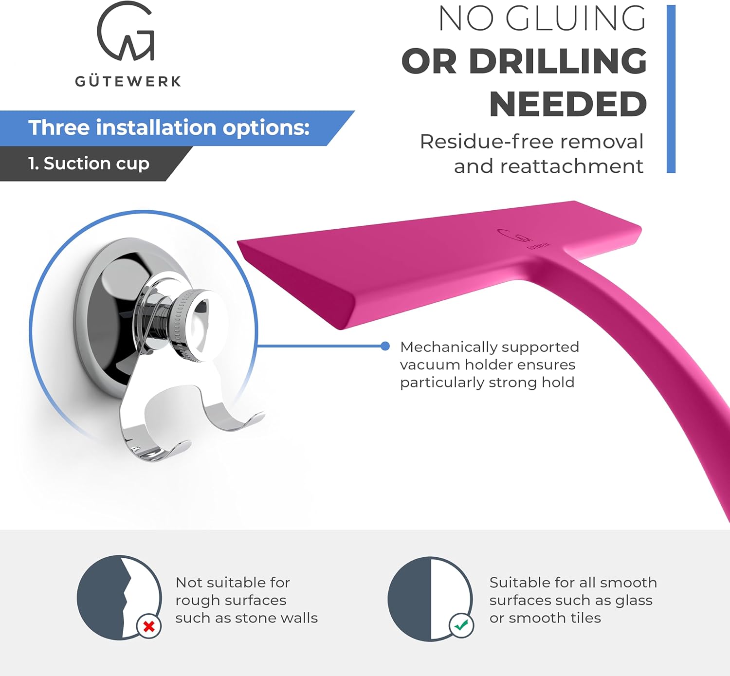 - SUPER STRONG SUCTION HOOK - No drilling or gluing required! You can easily remove and reattach the squeegee stainless steel hook to smooth surfaces such as panes, tiles, shower walls, shower glass surfaces, doors, cubicles, and enclosures.