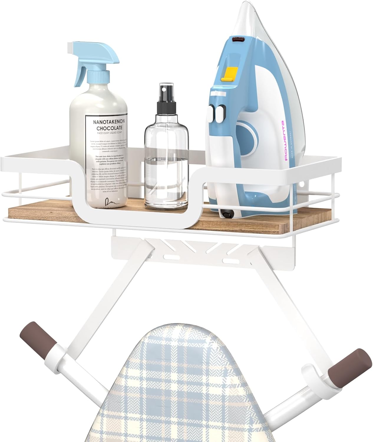 - MAKING YOUR HOME TIDY: The shelves for room wall small iron board hanger can keep all your items in one place, effectively use and organize your space. The ironing board hanger comes with storage metal wooden baskets and removable hooks to hold your iron, ironing stand, spray bottle and other ironing accessories for easy access.