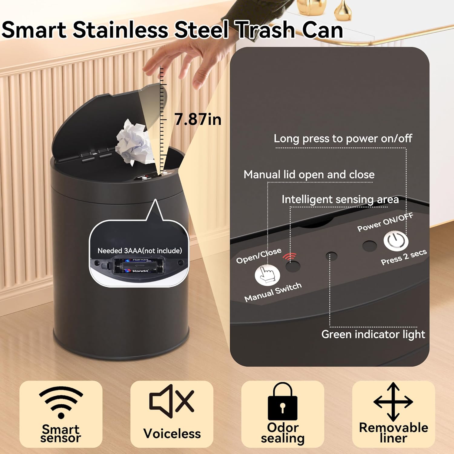 - WARM TIPS: Install 3 AAA batteries (not included) before using the round stainless steel garbage cans. For any product issues during use, please feel free to reach out to us, we will resolve them promptly