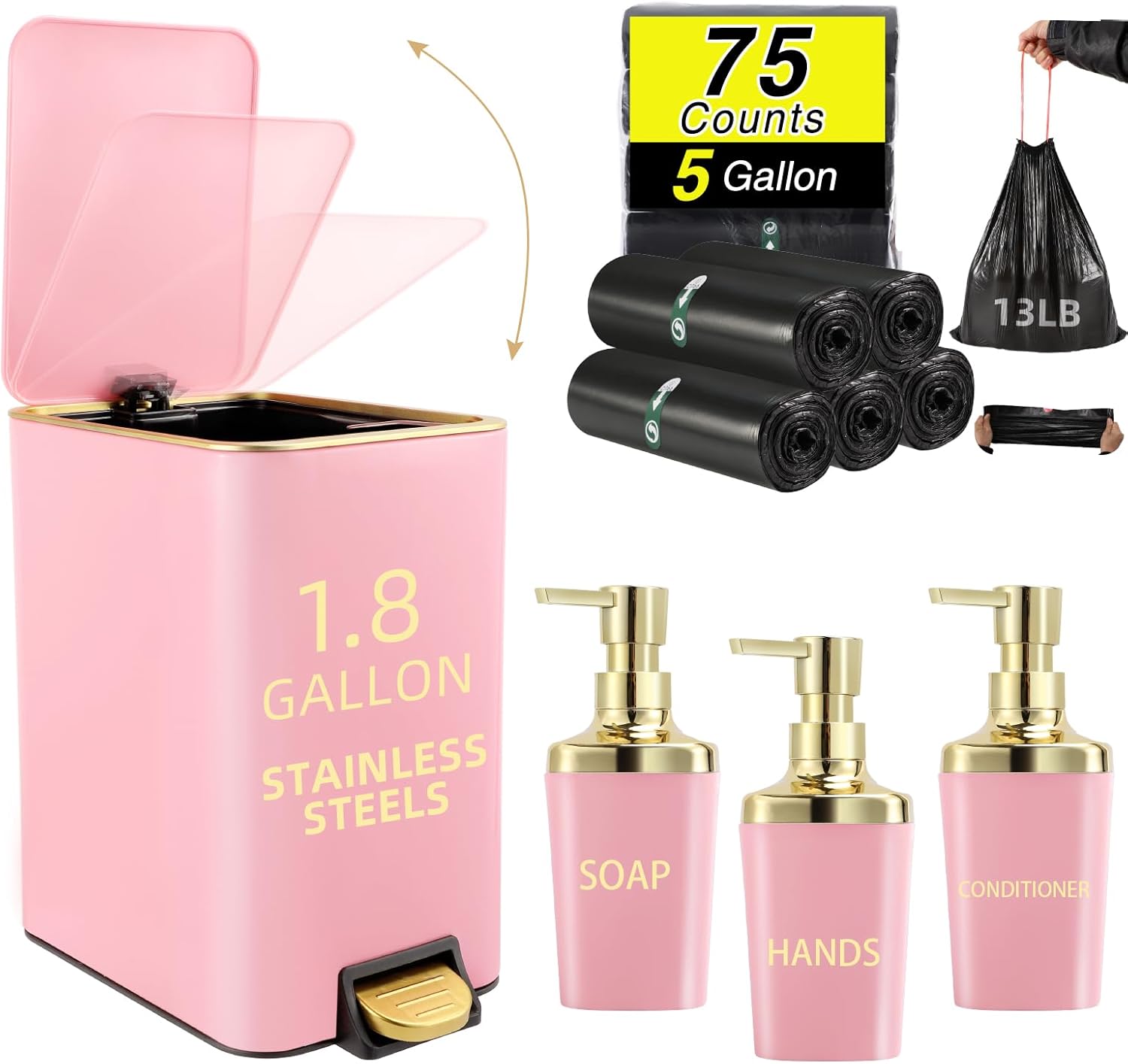 - [Package Included]:Trash can,3PCS Soap Dispenser,75 Count 5 Gallon Trash Bag,6 Waterproof Tags. each accessory is carefully selected to meet your daily needs.Our black and gold bathroom set is not only practical but also beautiful, making your bathroom space more neat and comfortable