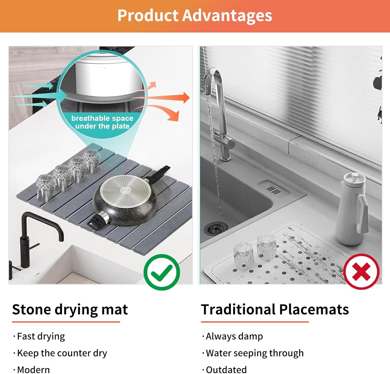 - ·Drying Mat: Stone Drying Mat for Kitchen Counter carefully selected natural diatom mud, this drying mat can absorb moisture in an instant, and then quickly air dry. Whether it is the kitchen countertop, or the bathroom countertop, it can always keep dry, effectively eliminate moisture hazards, avoid odor breeding, and create a fresh and clean living space for you.