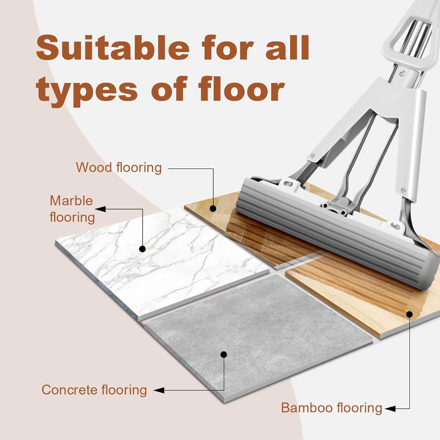 - SUPER ABSORBENT SPONGE HEAD: Made with high-quality sponge material, it absorbs water strongly and cleans stains effortlessly. Suitable for various floor types such as wood, marble, and tiles, ensuring excellent cleaning results.