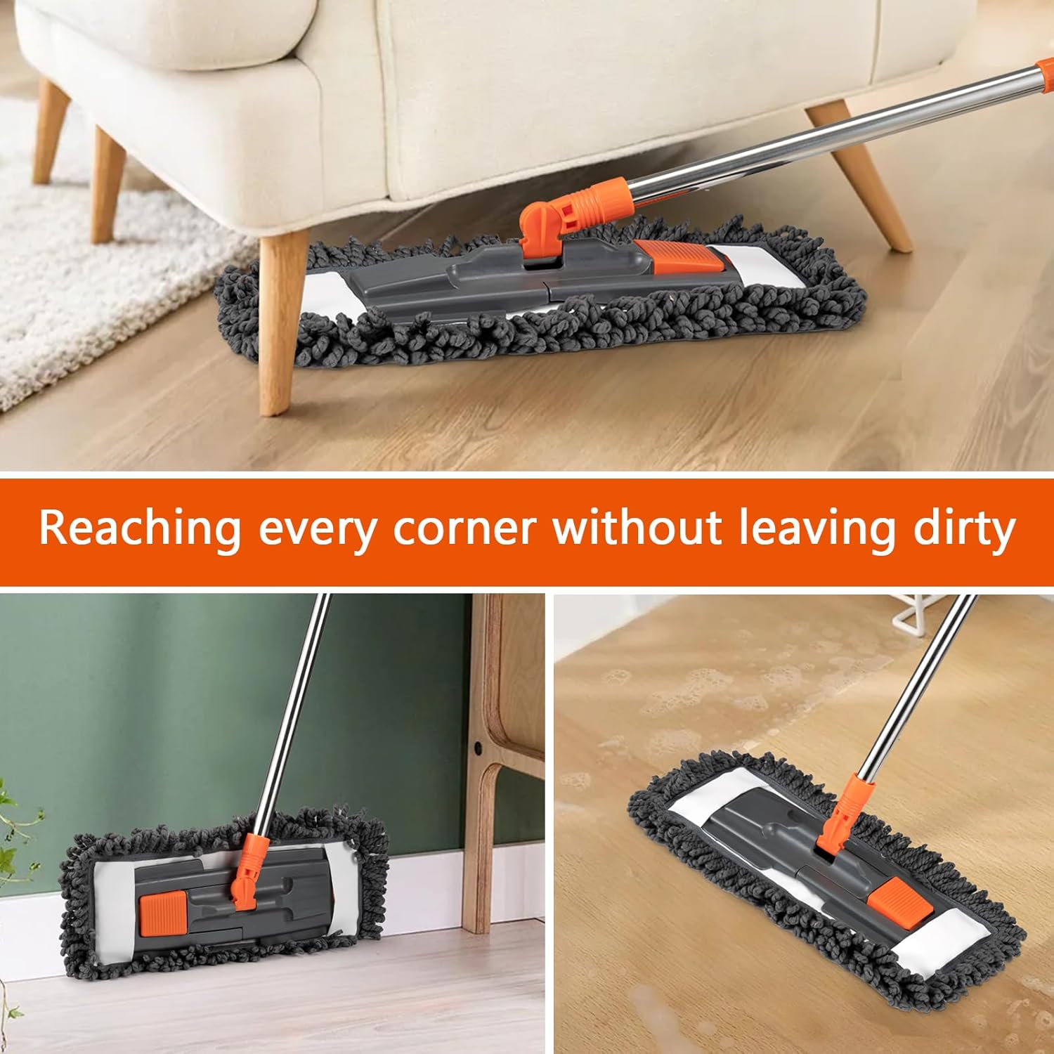 - 【Reliable & Affordable Mop】 This versatile mop comes with 3 dedicated cleaning heads (Chenille mop head, Terry cloth mop head,Microfiber mop head) to tackle any floor challenge—the super-absorbent microfiber pad quickly locks moisture, leaving hardwood floors dry and streak-free; the durable terry cloth head wipes away stubborn dirt and sticky residue on tile, stone, and hard surfaces; while the dense chenille pad uses powerful static to attract dust, pet hair, and fine particles, leaving all floors shining and streak-free. Three professional solutions, one easy-change system: effortlessly conquer your entire home.