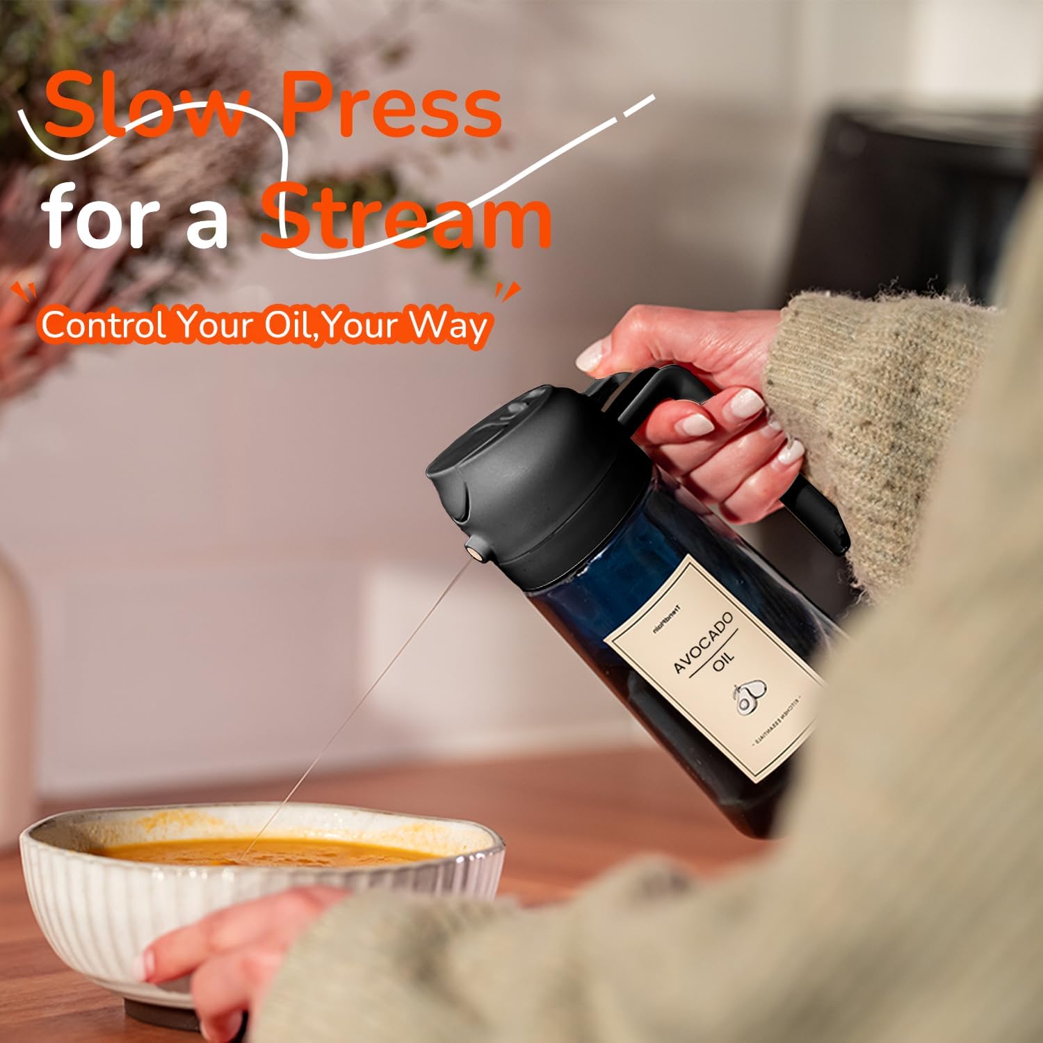 - Dual-Function: This 2 in 1 oil dispenser and oil sprayer offers both pouring and spraying capabilities, making it a versatile solution for your kitchen needs. Switching between the two functions is effortless, keeping your kitchen tidy and efficient
