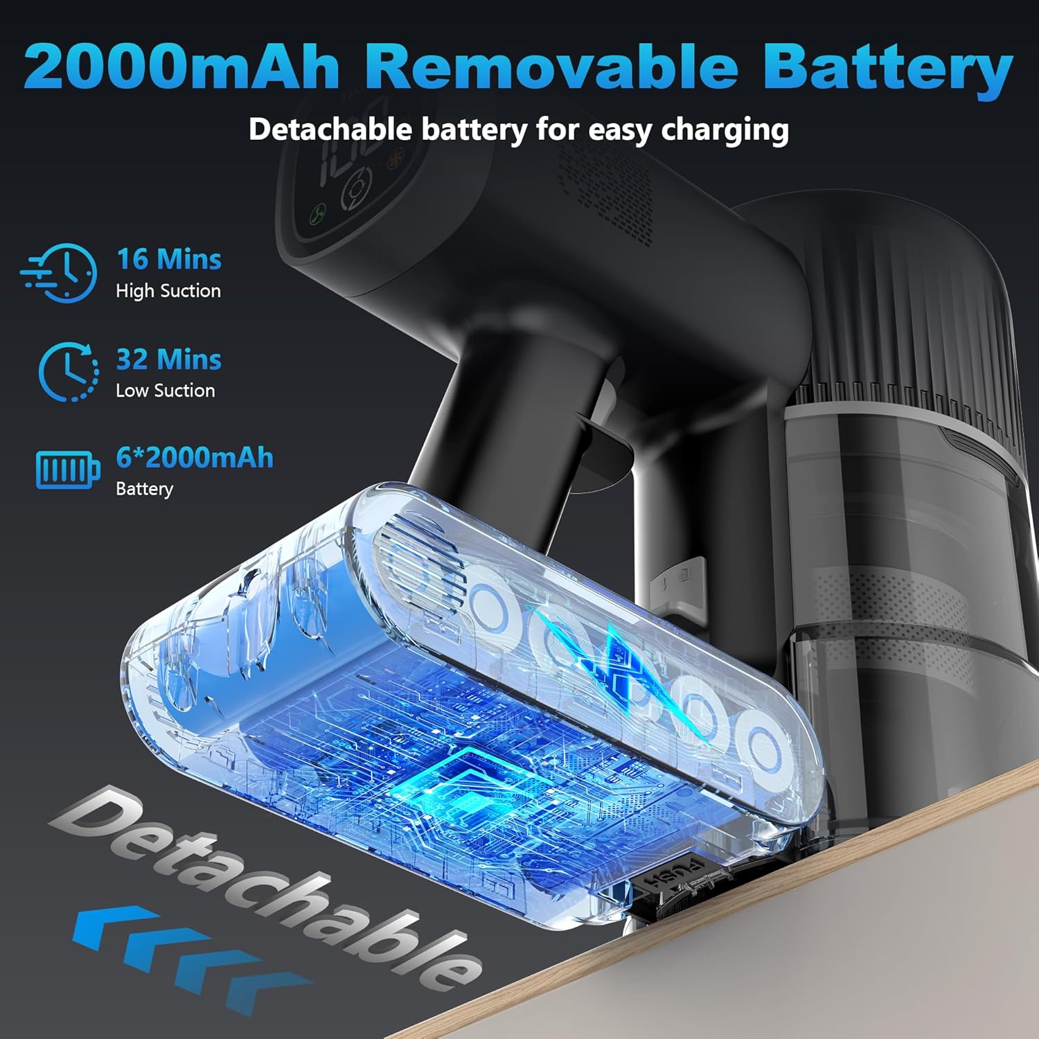 • Wall-Mounted Charging Dock: Featuring a 6*2000 mAh rechargeable battery and a wall-mounted charging station, this cordless vacuum cleaner offers versatile charging options. You can detach the battery for separate charging or place the vacuum on the dock for automatic charging and convenient storage