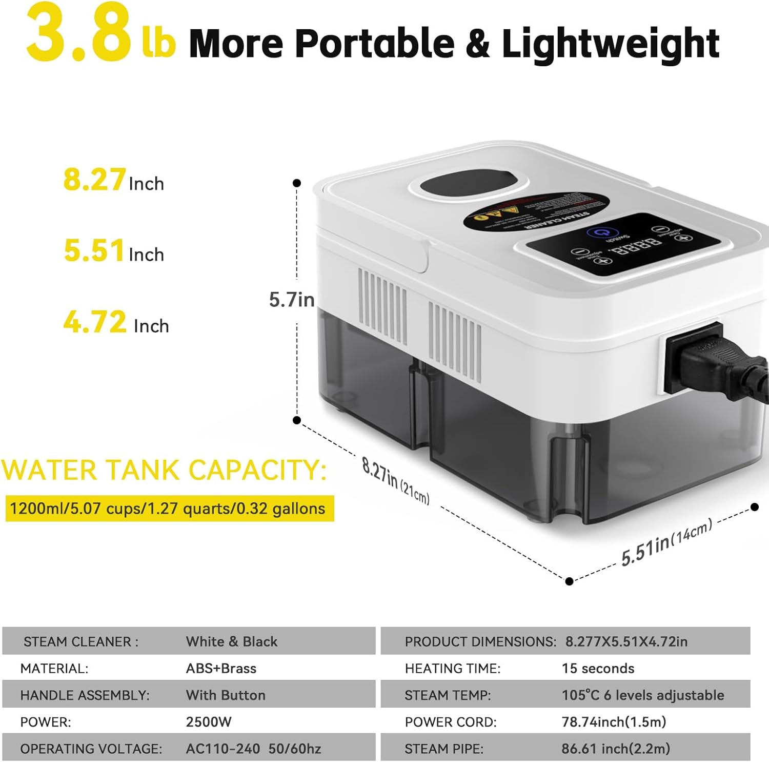 - 【Holds up to 1200ml ≈ 5 Cups (1.25 quarts / 0.32 gallons)Water Tank Capacity】1200ml (≈ 5 Cups) Large Water Tank make clean longer without constant refills! The flip-open lid makes topping up easy—no cooldown needed. One fill gives you up to 45 minutes of powerful steam, perfect for big cleaning jobs. TIPS: To prevent overfilling, it is recommended to keep the water level at or below this capacity.