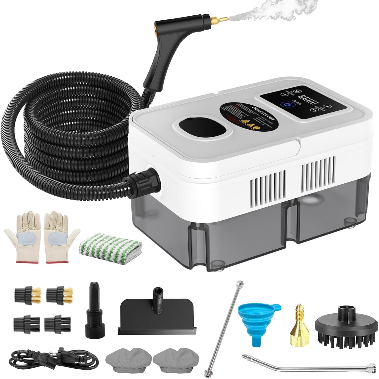 - 【Bonus Glove & Funnel Cleaning Kit Included】 Package includes: 1× Steam cleaner with tank, 1× 1.5m (78.74") Steam hose, 1× 2.2m (86.6") Power cord, 2× Extension rod tubes, 2× Brass brushes, 2× Nylon brushes, 1× Large round plastic brush, 2× Multi-purpose adapters (1 Brass & 1 Plastic) 2× Cleaning cloth sleeves, 1× Window scraper, 3× Waterproof rings, , 2× Heatproof gloves, 1× Collapsible silicone funnel, 1× Microfiber cloth, and 1× User manual—everything you need for professional-level steam cleaning.