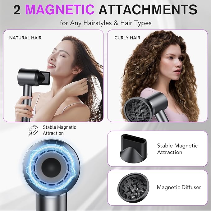 - 【Professional Styling, All-in-One Versatility】This powerful hair dryer comes with magnetic diffuser and concentrator nozzles for effortless straight or curly styling. The magnetic diffuser enhances curls by evenly dispersing airflow, boosting bounce and reducing frizz for fuller definition. The magnetic concentrator nozzle directs airflow precisely to dry and straighten hair faster for a sleek, glossy finish. Both attachments switch in just 4s—no hassle.