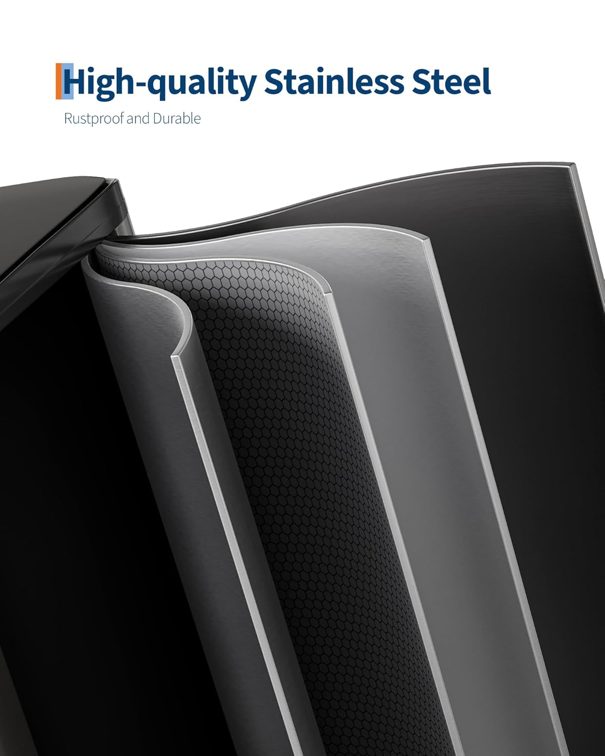 - [HIGH-QUALITY MATERIALS] β GarveeHome stainless steel trash can with lid is engineered for longevity. Its 410 Garade ferritic stainless-steel shell delivers rustproof strength, scratch resistance and lasting luster. Two polypropylene inner buckets repel stains, odors and moisture. A thick ABS lid with stainless overlay resists dents; the industrial steel pedal endures 150,000+ steps and the one-piece ABS hinge survives over 300,000 open/close cycles