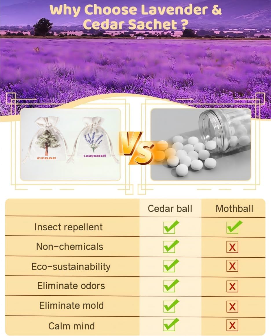 • Natural and Safe: Our sachet bags are made from 100% natural ingredients, providing a safe and eco-friendly option for your family. The combination of cedar blocks for clothes storage and lavender not only imparts a delightful scent but also protects your garments