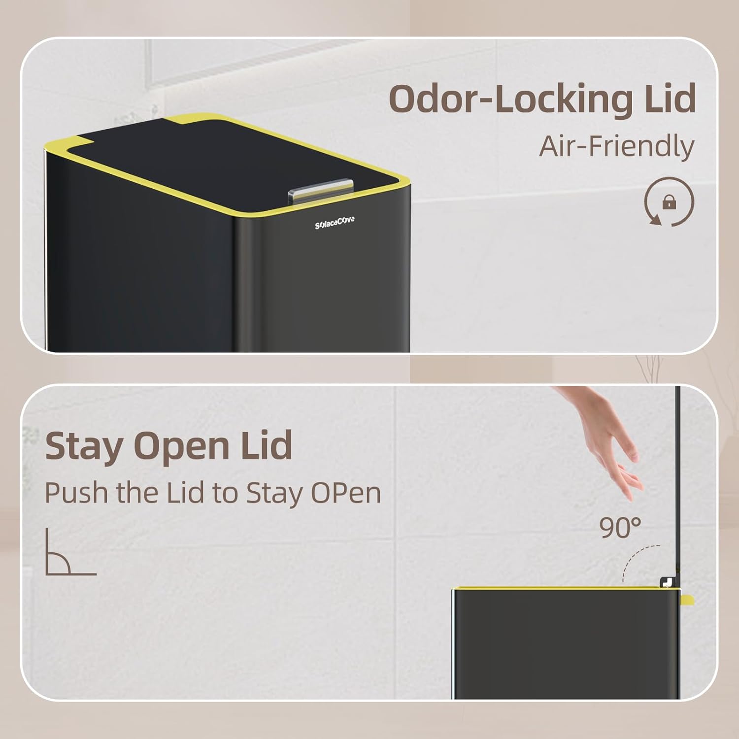 - Soft Close & Stay Open Lid:The stainless steel trash can is made of a stay open function and pushes the lid at 90° when release the pedal.The lid can be closed quietly without causing noise interference to others