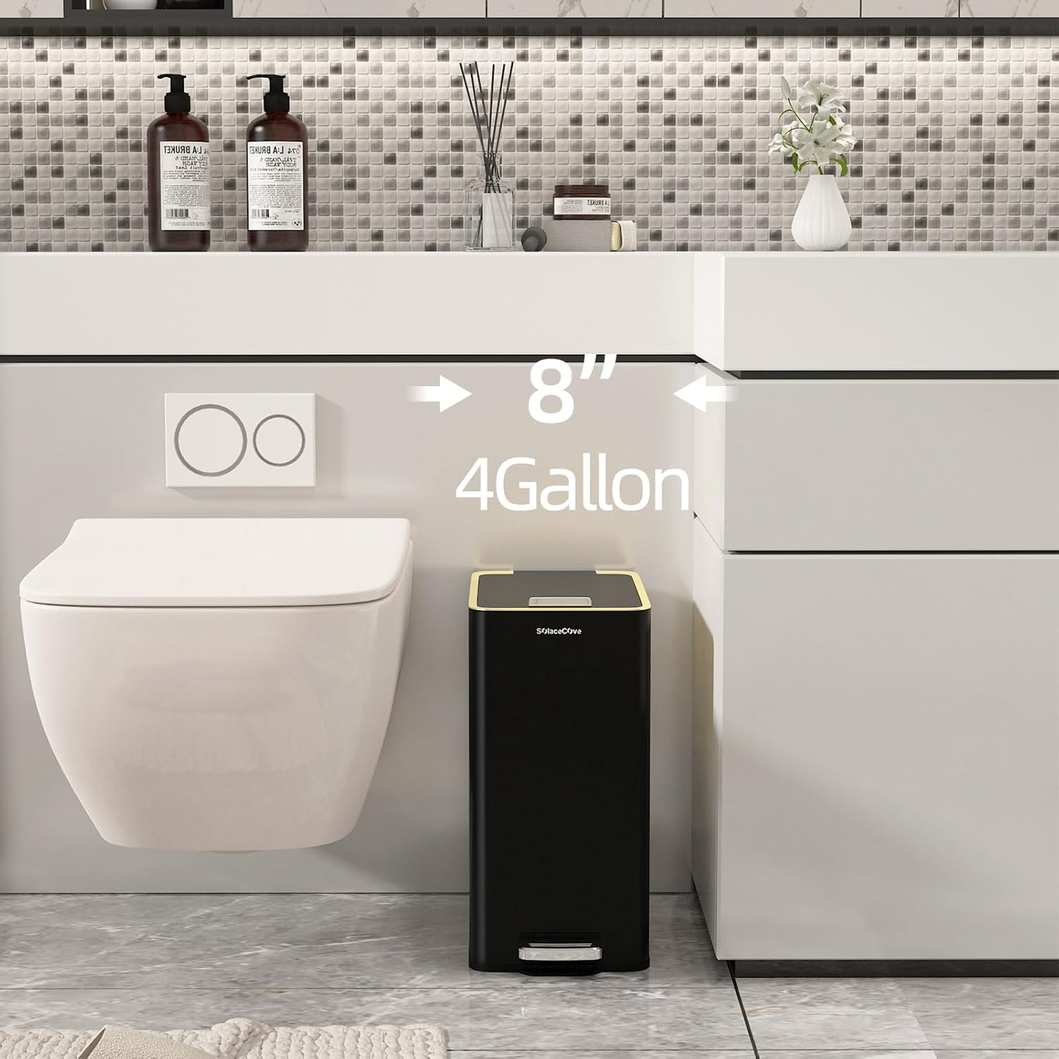 Stainless Steel Trash Can with Soft Close Lid,15 Liter/4 Gallon Garbage Can Kitchen Removable Wastebasket, Rectangular for Bathroom, Office (Black)