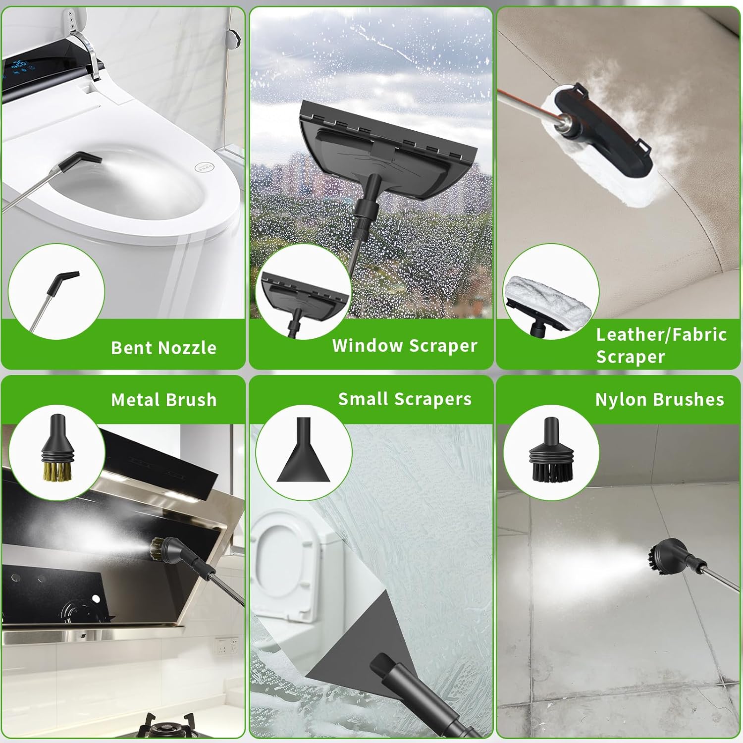 • Versatile 15-Piece Accessory Kit: Includes 2 nylon and 1 brass brushes, 2 nylon nozzles, 2 flat scrapers, 1 window scraper with towel cover, 1 extended nozzle, 2 gloves, 1 needle for cleaning scale, 1 wrench and 1 storage bag. This cleaning steamer kit is perfect for cleaning kitchen grease, car interiors, glass, grout, and more