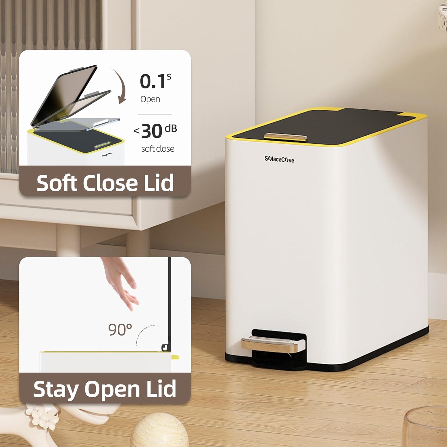 - 【Silent Step Pedal & 90°Stay-Open Lid】The soft-close mechanism operates whisper-quiet,while the lid stays securely open at 90° for hands-free use.No more loud bangs when taking out the trash!