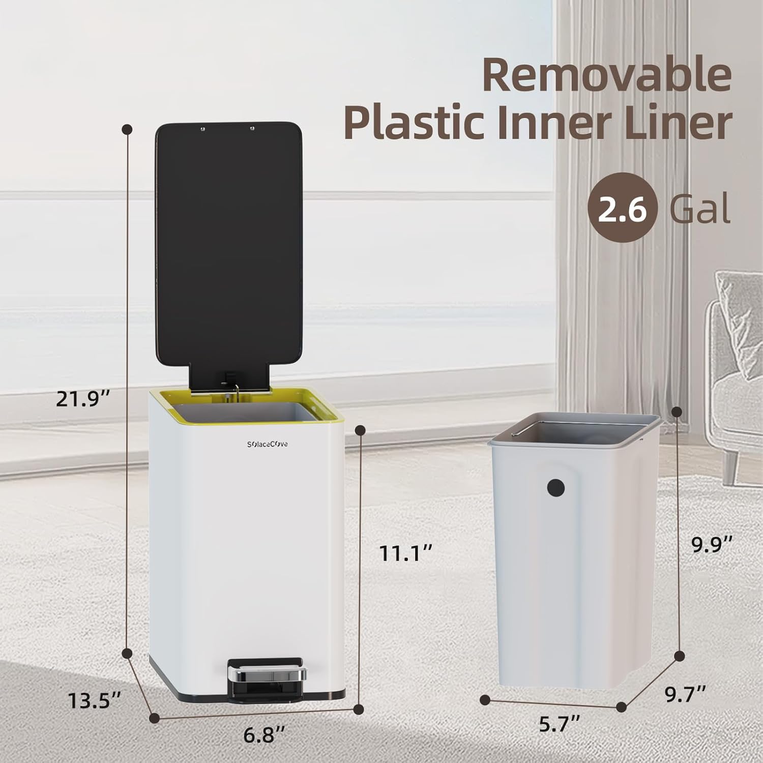 - 【Odor-Sealing ABS Lid】The tight-sealing white ABS lid locks in smells and keeps trash out of sight.Maintains a fresh, hygienic environment in any room.