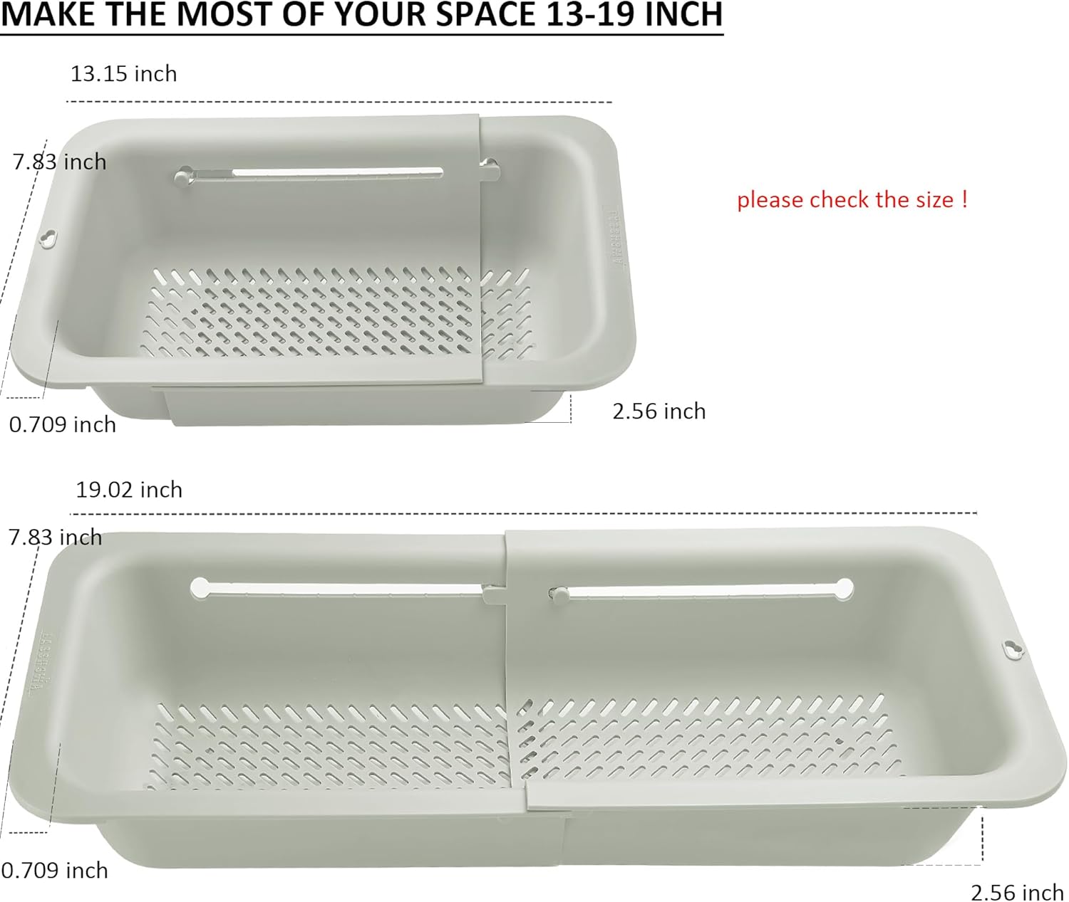 - LASSHSWA Over the sink extendable strainer, SIZE: 13-19 in (smaller space-saving design) . Stainless steel drain strainer, SIZE: Outer diameter: 4.5”; inner filter: 3”; depth: 1” . They fit for most kitchen sinks and drains.