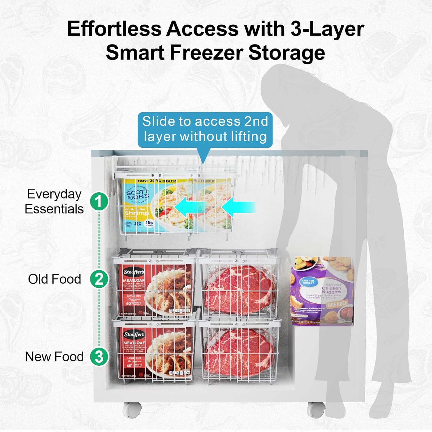 - [Easy to Get & Rearrange] Fold down the handles to stack the chest freezer organizer bins to fully use the freezer space; Easily lift the bottom basket to get items, When organizing the freezer, just need to rearrange the chest freezer basket, without having to rearrange each package of food