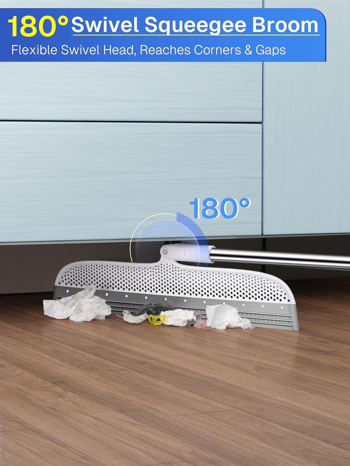 - 【180-Degree Maneuverability】The swivel head on this squeegee broom pivots to clean tight spaces regular brooms miss. Easily reach under furniture and into corners with the flexible rubber broom design.