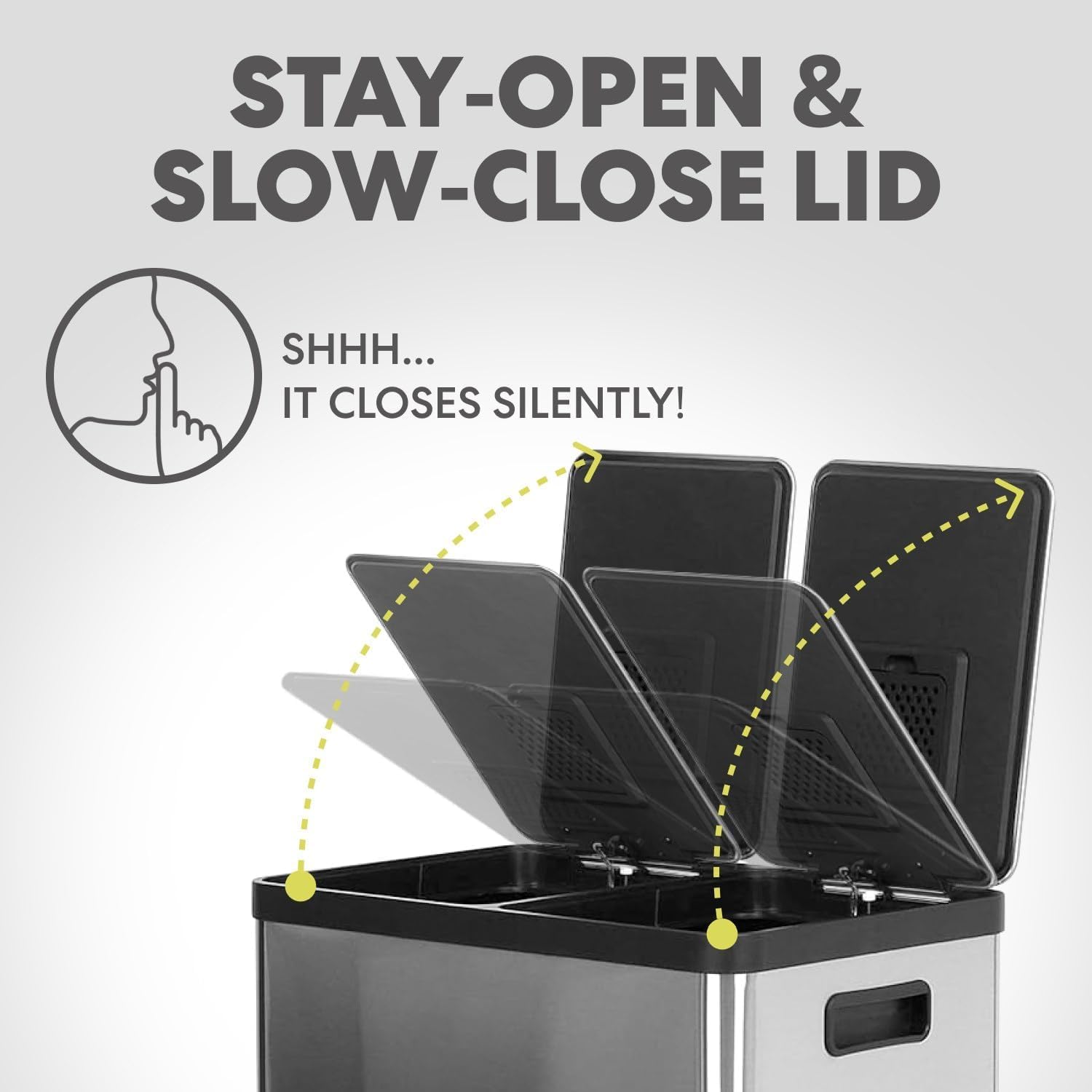 - SLOW CLOSE LID: Quiet, controlled lid closure is designed to reduce unwanted noise and ease down gently.LID LOCK: Extended open lid lock keeps the container open for longer tasks and chores.