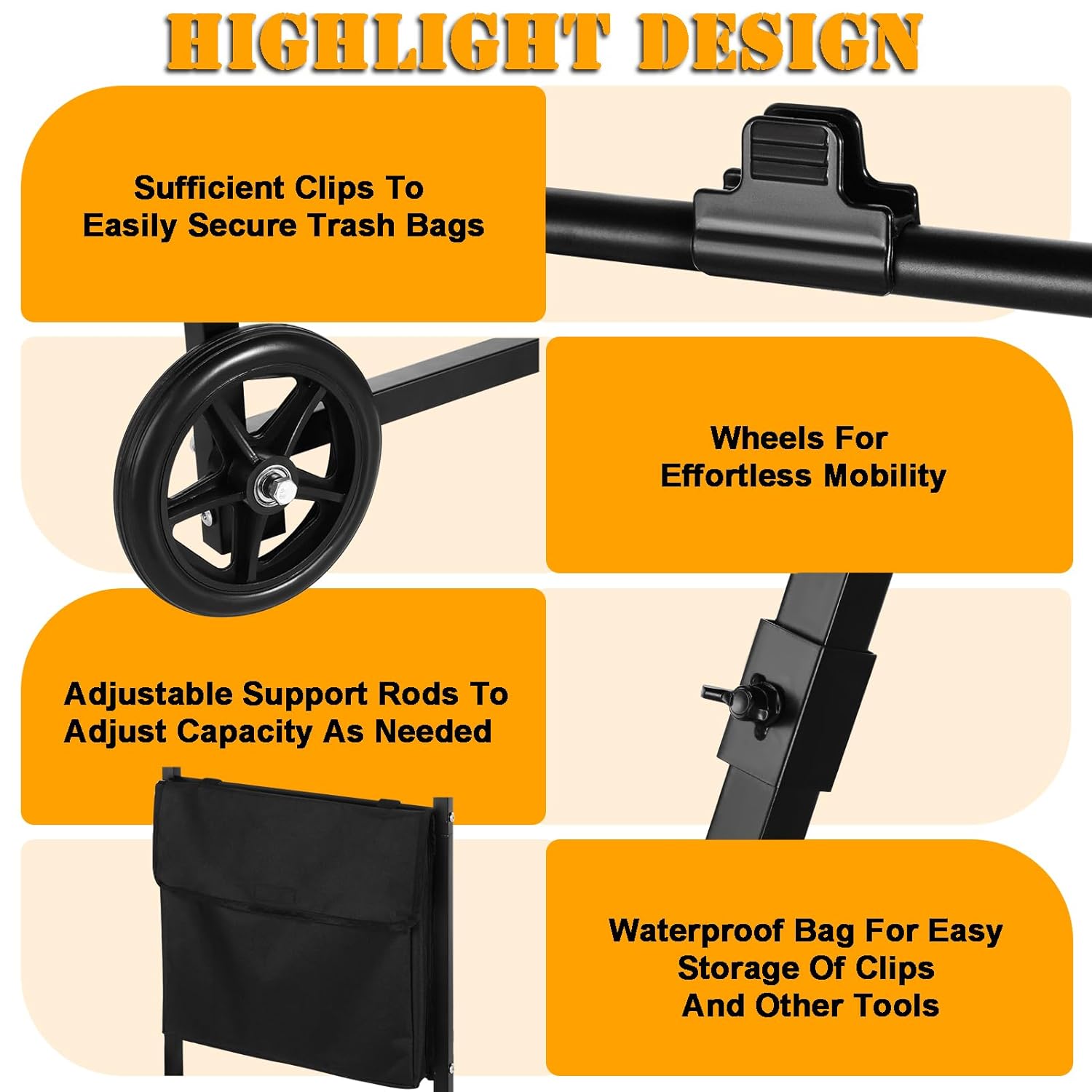- Mobile Trash Bag Holder with Wheel Design: This leaf bag holder is made of heavy-duty steel frame, with powder coating that is sturdy and durable, resistant to wind and rain. The convenient design of the rear wheels can save you effort and improve your efficiency in handling garbage, while the two brackets can provide excellent stability.