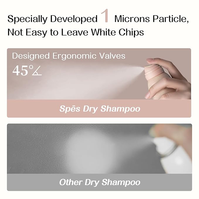 - NO WHITE RESIDUE AFTER USE: Spes Instant Fresh Volume Dry Shampoo uses a unique patent to make the diameter of the cleaning particles only 1 micron, which is 1/200 of the diameter of the hair. It instantly absorbs oil and restores fresh and volumized hair without leaving any white streaks or residue on your hair.