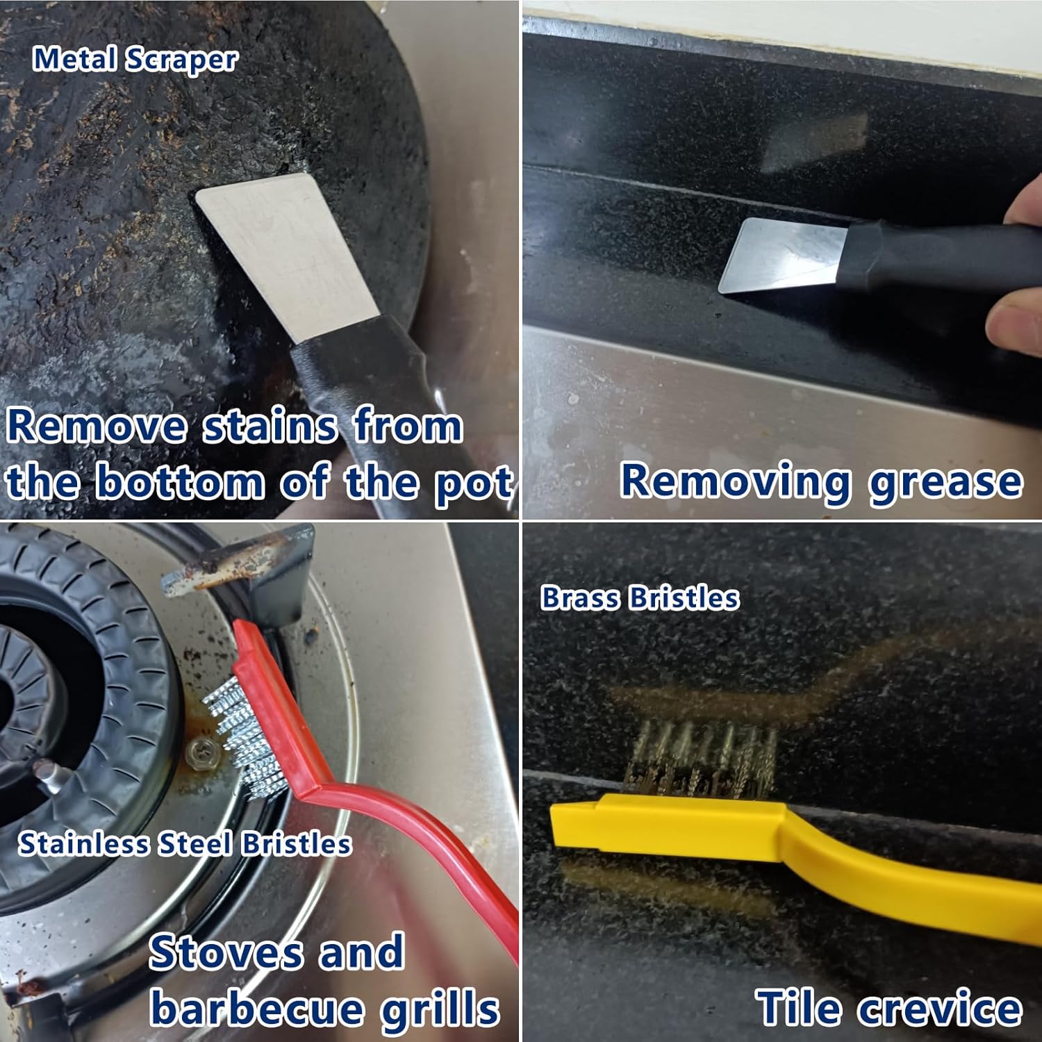 - Three Specialty Bristles for Targeted Cleaning: Three professional brush heads tackle different surfaces:Brass Brush: Specifically conquers stubborn grease, burnt-on residue on pot bottoms, and carbon buildup on gas stoves.Stainless Steel Brush: Powerfully removes stains, scale, and rust with noticeable results.Nylon Brush: Ideal for delicate surfaces (like faucets, tile grout), cleaning effectively without scratches.Includes Scraper: Easily scrapes away stubborn, caked-on residue.