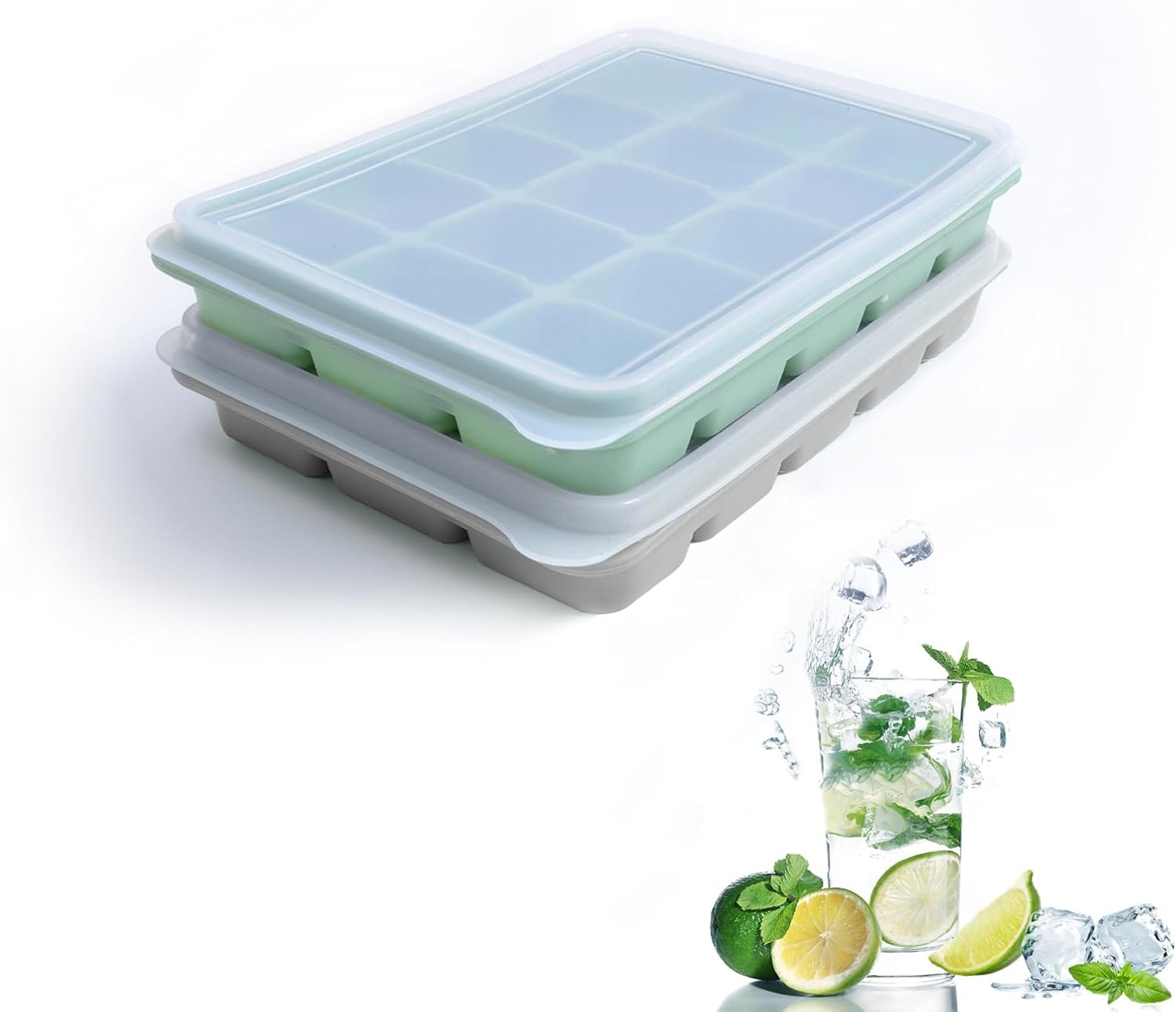 Ice Cube Trays Set of 2, Easy Release 15 Flexible Silicone Ice Cube Molds with Removable Lid Reusable Freezer Ice Trays Stackable for Whiskey, Baby Food, BPA Free (GREEN+GRAY)