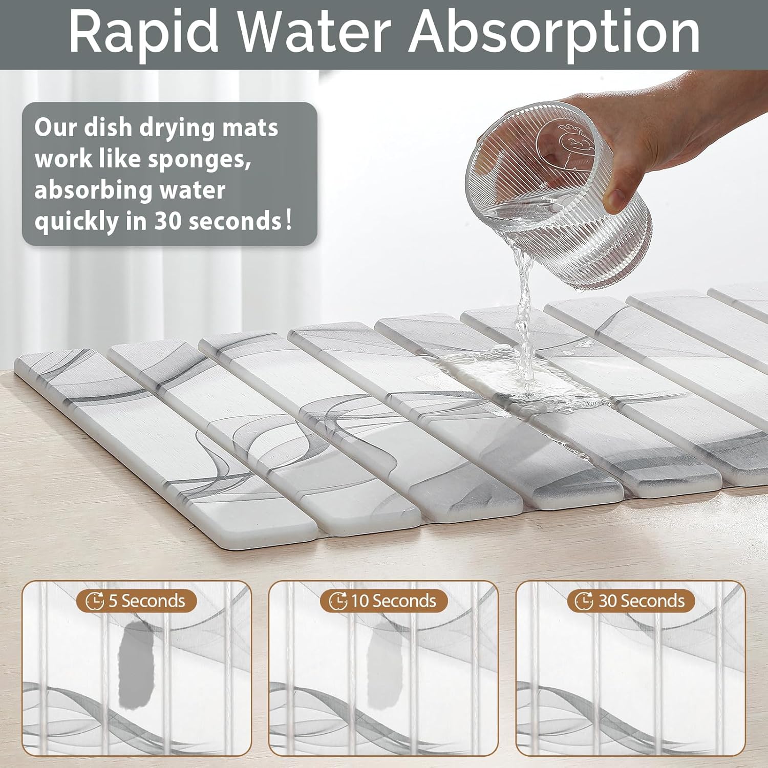 - 【Wide application】Collapsible stone dish drying mat helps maintain a clean kitchen, ensuring your surfaces stay neat and fresh. The large stone drying mat acts also as a heat-resistant mat, protecting countertops from hot pots and pans. kitchen drying mat also doubles as a bath mat, plant saucer, or pet feeding mat, offering flexibility for various home uses.