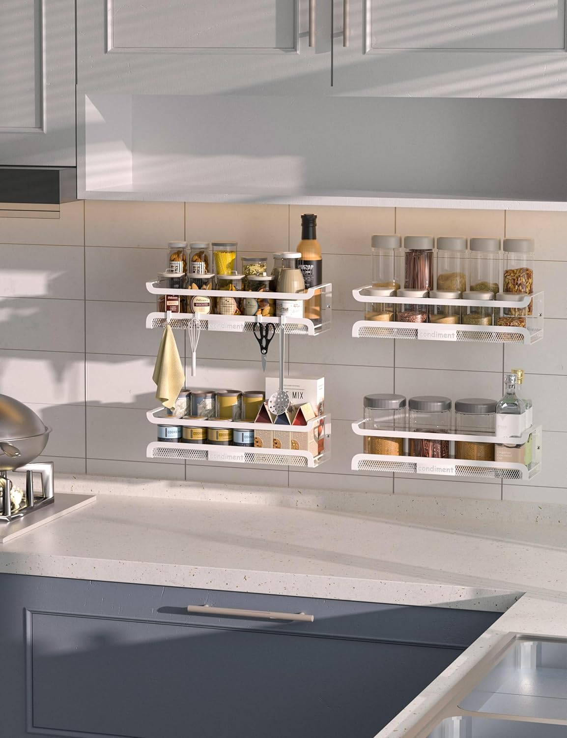 Spice Rack Wall Mount with Hooks - Spice Racks Organizer for Cabinet Storage, Wall Mounted Hanging Shelf Seasoning Organizer, for Kitchen, Pantry Door, Bathroom (White, 2 Pack)