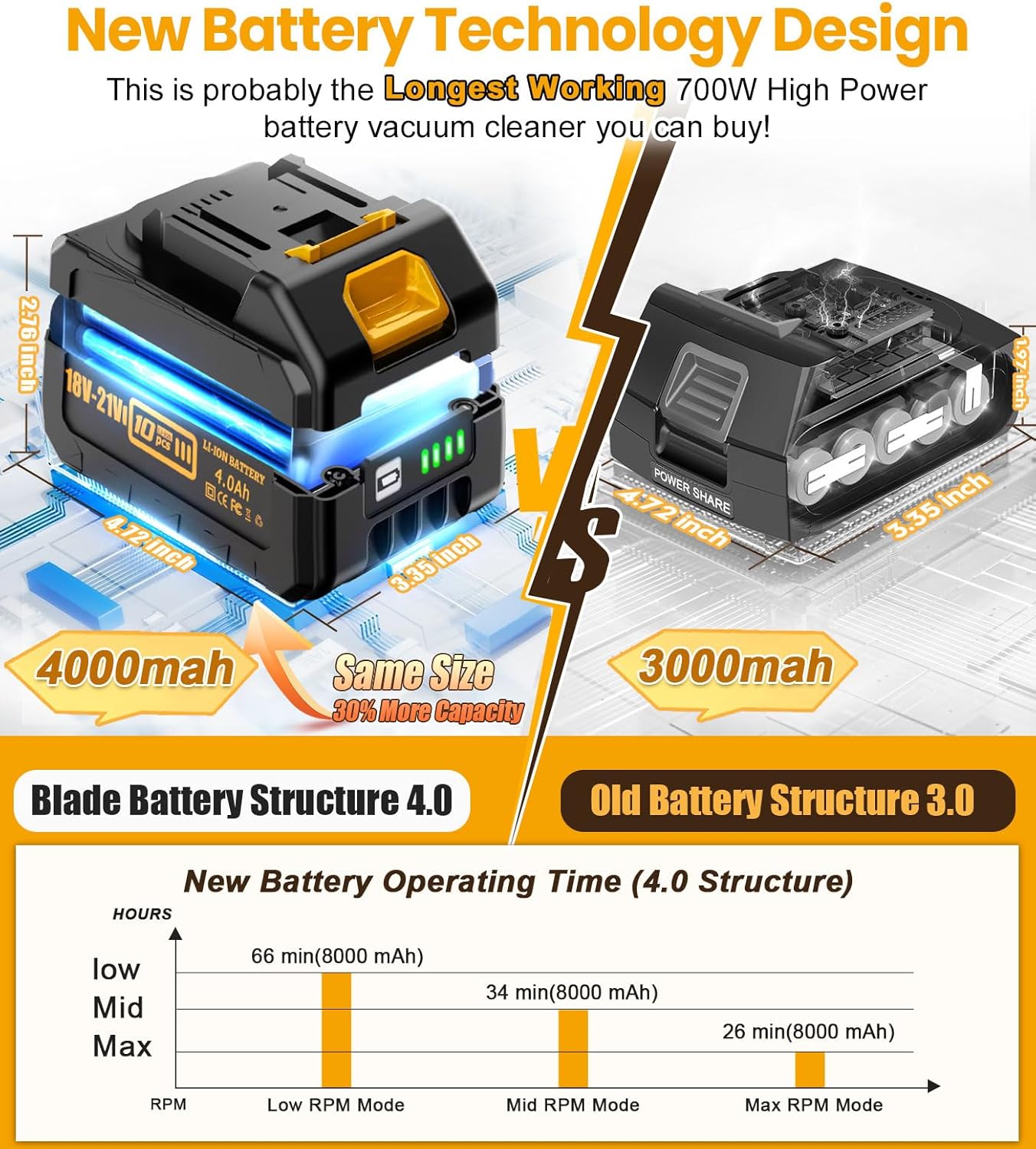 - ใ๐๐๐ฌ๐ญ ๐๐๐ซ๐ญ๐ข๐๐ข๐๐+ ๐,๐๐๐๐ฆ๐๐ก ๐ฅ๐๐ซ๐ ๐ ๐๐๐ญ๐ญ๐๐ซ๐ฒ ๐๐ง๐ ๐๐ก๐๐ซ๐ ๐ข๐ง๐ ๐ญ๐ข๐ฆ๐ใThis is probably the Longest Working battery electric vacuum cleaner you can buy! The latest technology 4.0 blade compression construction battery is the same size and has 30% more capacity compared to the old 3.0 construction battery. 5 hours to fully charge,two batteries can work continuously for 66 minutes (low mode). The vacuum cleaner is powerful, so it runs for a short time, but it is sufficient to clean every corner of your home.