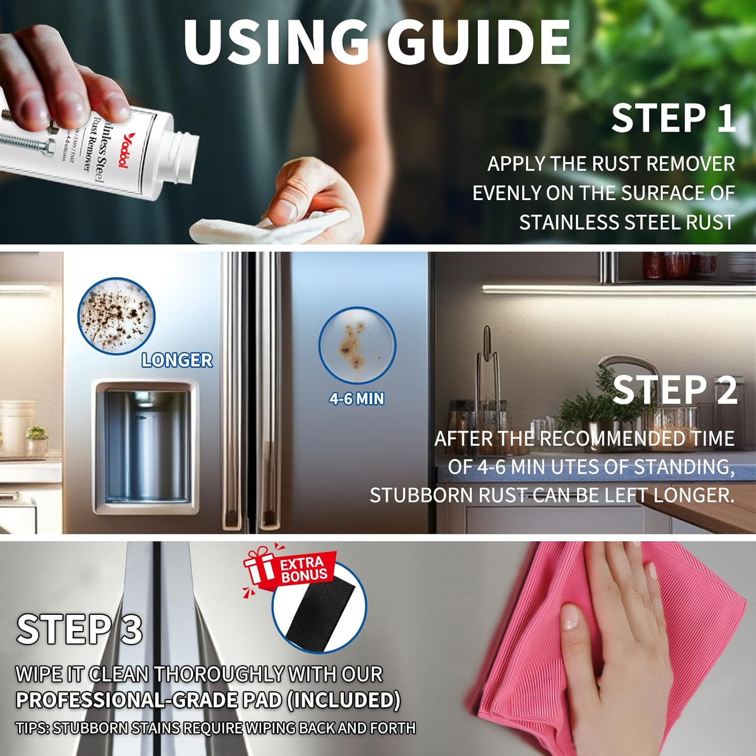 - EFFORTLESS USAGE: Simply apply, let stand for the recommended time of 2-3 minutes, and then rinse. No need for laborious scrubbing, saving time and effort. Rust removal and maintenance can extend the service life of stainless steel appliances, and long-term use is more cost-effective