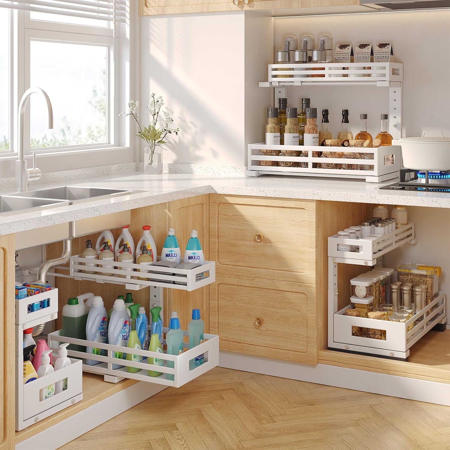 2-Pack 17"Deep Under Sink Organizer And Storage, 2-Tier L-Shaped Pull Out Cabinet Organizer with Upgraded Slide Rails, Height Adjustable Drawers for Kitchen&Bathroom, Extra-Large Storage Shelves–White