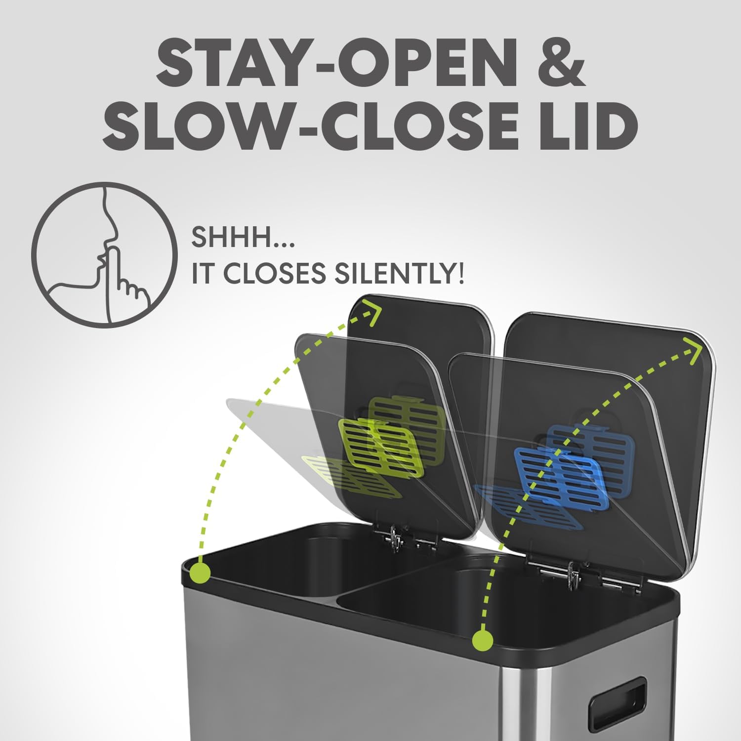 Simpli-Magic 18.5 Gallon (40L x 30L) Dual Compartment Step Trash Can – Kitchen Garbage Can with Waste & Recycling Bins – Slow-Close Lid, Odor Control, Hands-Free, Stainless Steel