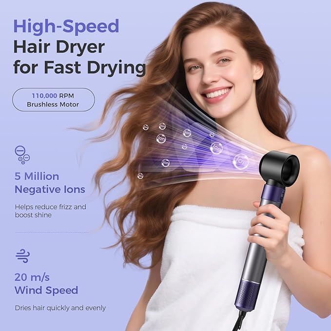 - [7-in-1 Multi-Styler Powerhouse] Includes 1.25" Auto-Wrap Curlers (Left & Right), an oval brush, round brush, straightening brush, and concentrator nozzle—so you can switch between silky straight and bouncy curls without switching tools. The 110,000 RPM high-speed motor delivers powerful airflow up to 23m/s, helping you dry and style in half the time while reducing frizz, heat damage and adding shine.