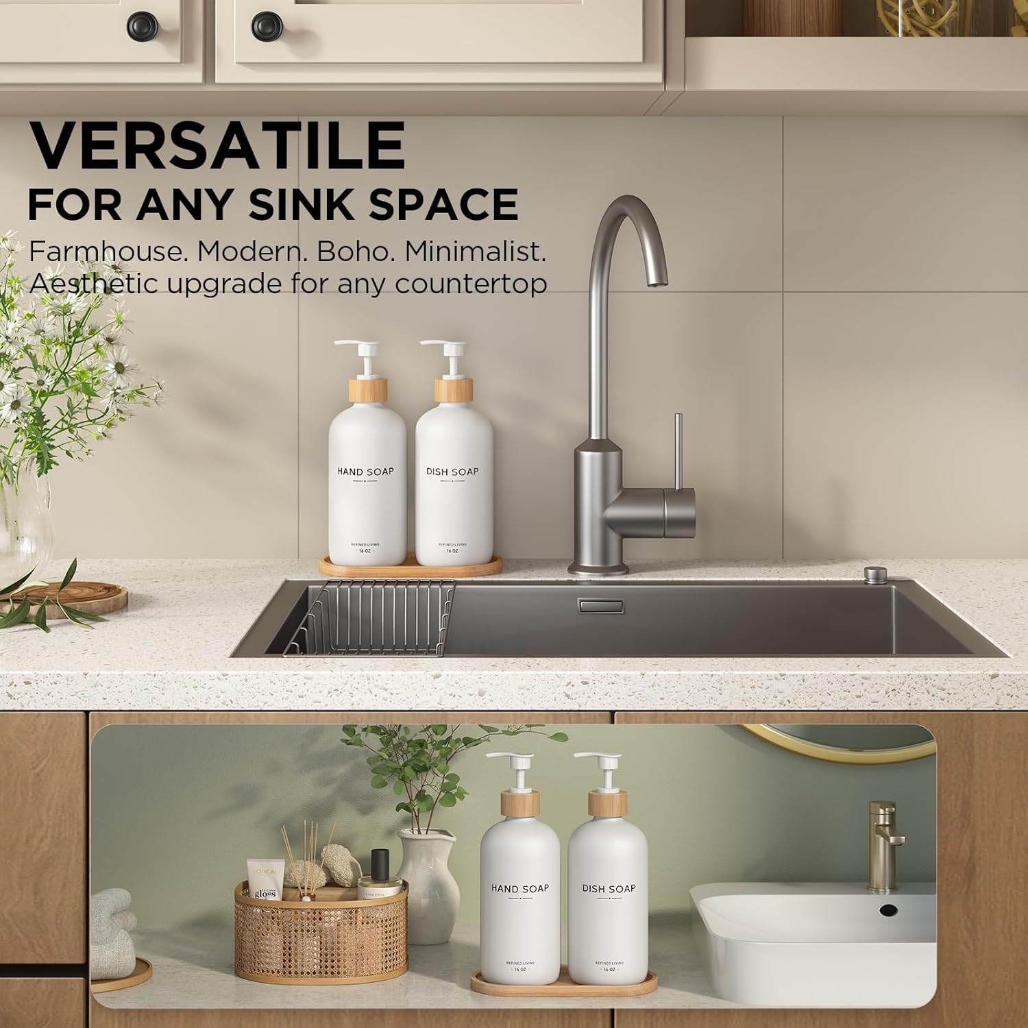 Hand and Dish Soap Dispenser Set,16oz Glass Bottles with Printed Labels, Bamboo Tray & Pump,Countertop Soap Dispensers for Kitchen,Luxury, Minimalist & Farmhouse Decor (Hand Dish (White))